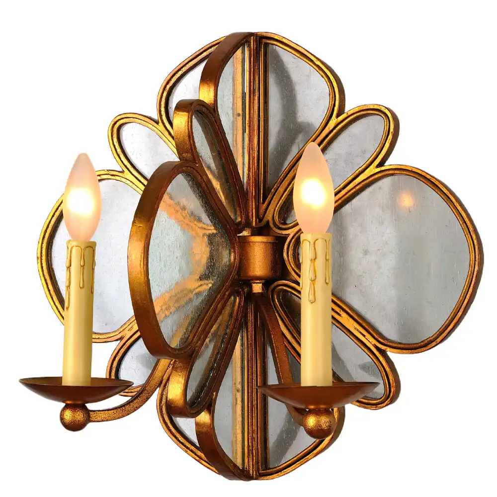 Introduce a touch of opulent artistry and dazzling, warm illumination to your interiors with our Opulent Gilded Floral & Mirrored Petal 2-Light Wall Sconce with Faux Candle Drips. Meticulously handcrafted at our professional decorative light fixture factory in China, this exquisite wall lighting piece embodies a profound understanding of baroque, glamorous, traditional, and Art Deco interior design. It seamlessly blends high-strength metal with a rich hand-applied gilded gold finish, unique mirrored “petals,” and two realistic faux candle holders. Designed for enduring beauty, stability, and long-term reliability, it’s an ideal selection for discerning designers and end-users seeking distinctive, artistic, and functionally superior lighting solutions for grand entryways, formal living areas, dining rooms, or any space desiring a sophisticated, historical focal point.