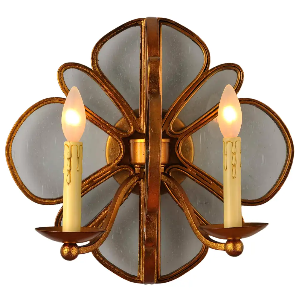 This two-light wall sconce is constructed from robust, high-strength metal, ensuring a stable structure that is built to withstand time and provide long-term compatibility. The distinguished hand-applied gilded gold finish offers a deep, rich appearance with subtle gold undertones and a sense of aged luxury, beautifully complementing the reflective mirrored elements. This durable finish, combined with the ornate stylized floral or bow-like metal frame, multiple mirrored “petals” or segments that radiate outward, and two prominent faux candle covers with drip details (bulbs not included), creates an artistic and powerful presence. The mirrored petals reflect the light, amplifying its brilliance and casting intriguing patterns, while the faux candle covers provide a traditional, cozy ambiance without the need for real candles, enhancing a grand and stylish atmosphere with refined luxury.