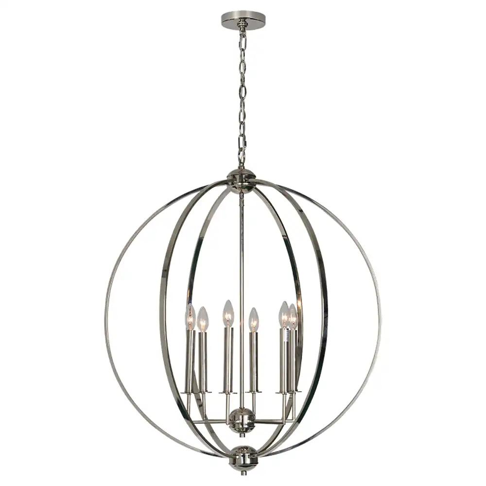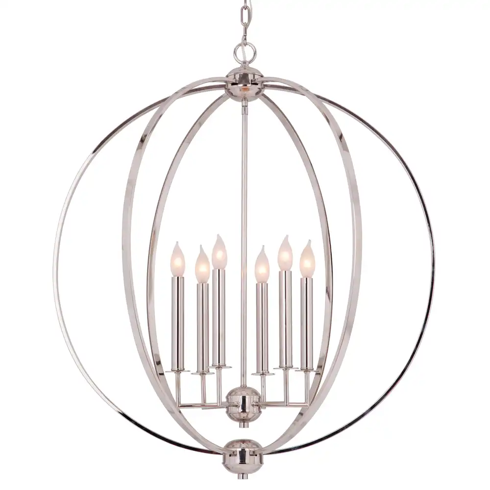 The “Orbital Bloom” Modern Globe 6-Light Chandelier is a captivating design that reflects a profound understanding of contemporary interior decoration and sculptural lighting. This striking fixture showcases a brilliant Polished Nickel finish—precisely a highly reflective, mirror-like silver tone that exudes exceptional luminosity and a crisp, sophisticated aesthetic. This finish is renowned for its ability to brighten a space, complement a diverse range of color palettes, and seamlessly integrate into upscale modern or transitional environments.