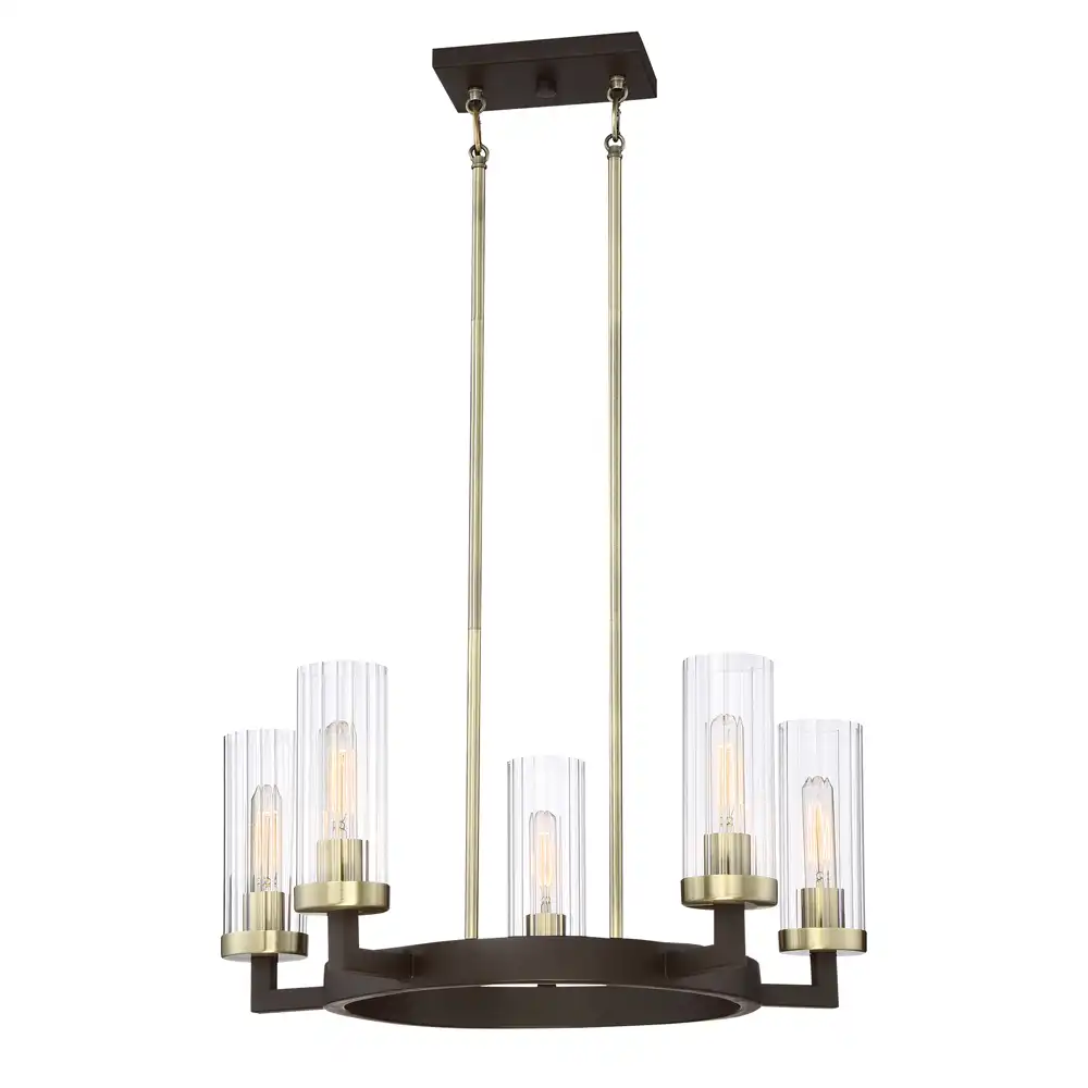 The “Orbital Cascade” chandelier showcases five individual light sources, each elegantly encased within a clear, ribbed glass cylinder shade. The vertical fluting of the glass shades adds a subtle texture and visual interest, beautifully diffusing the light while maintaining clarity, and creating a sophisticated sparkle. These shades are arranged symmetrically around the circular frame, providing expansive and balanced ambient illumination that is perfect for dining rooms, living areas, entryways, or bedrooms. Its sophisticated blend of finishes and classic forms makes it versatile for traditional, transitional, and even modern interiors seeking a touch of warmth and elegance.