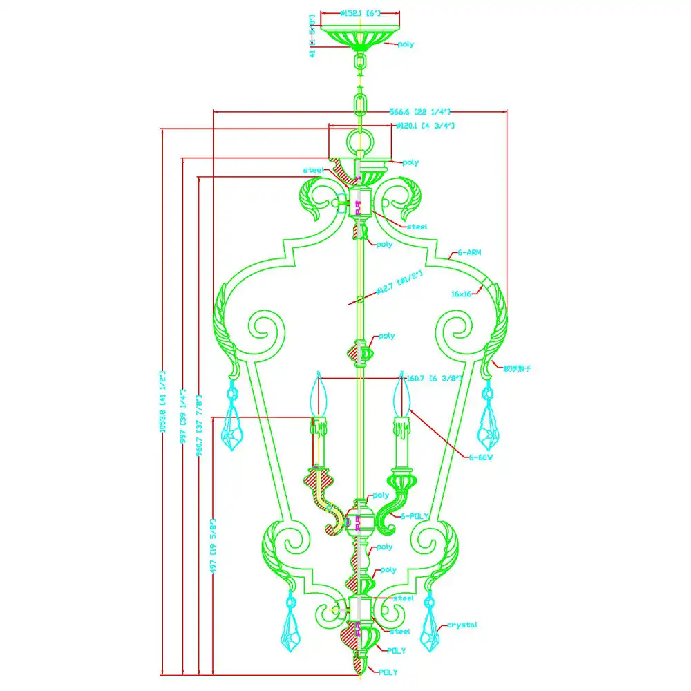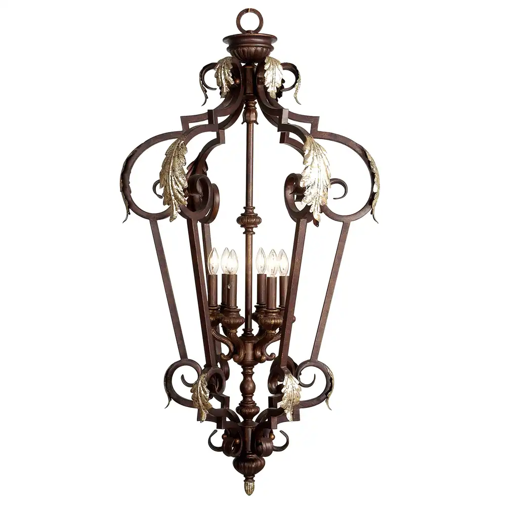 This ornate 6-light pendant lantern reflects the grandeur of classical European design, skillfully handcrafted to merge robust construction with decorative artistry. Made from high-strength wrought iron, the frame is finished in a rich antiqued bronze with hand-applied distressed copper undertones, giving the surface depth and a time-honored patina.
