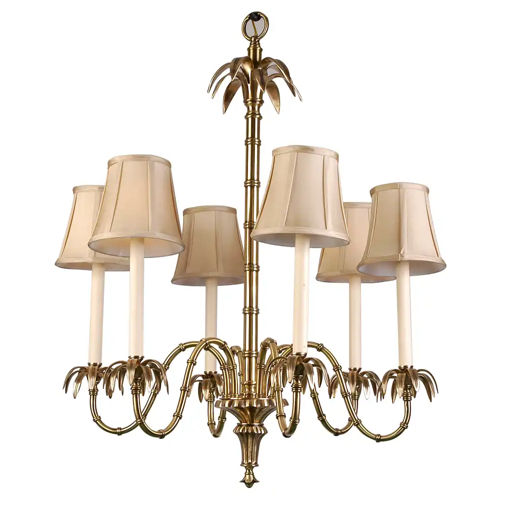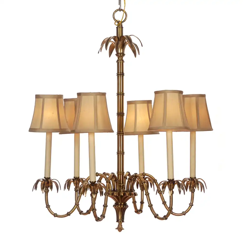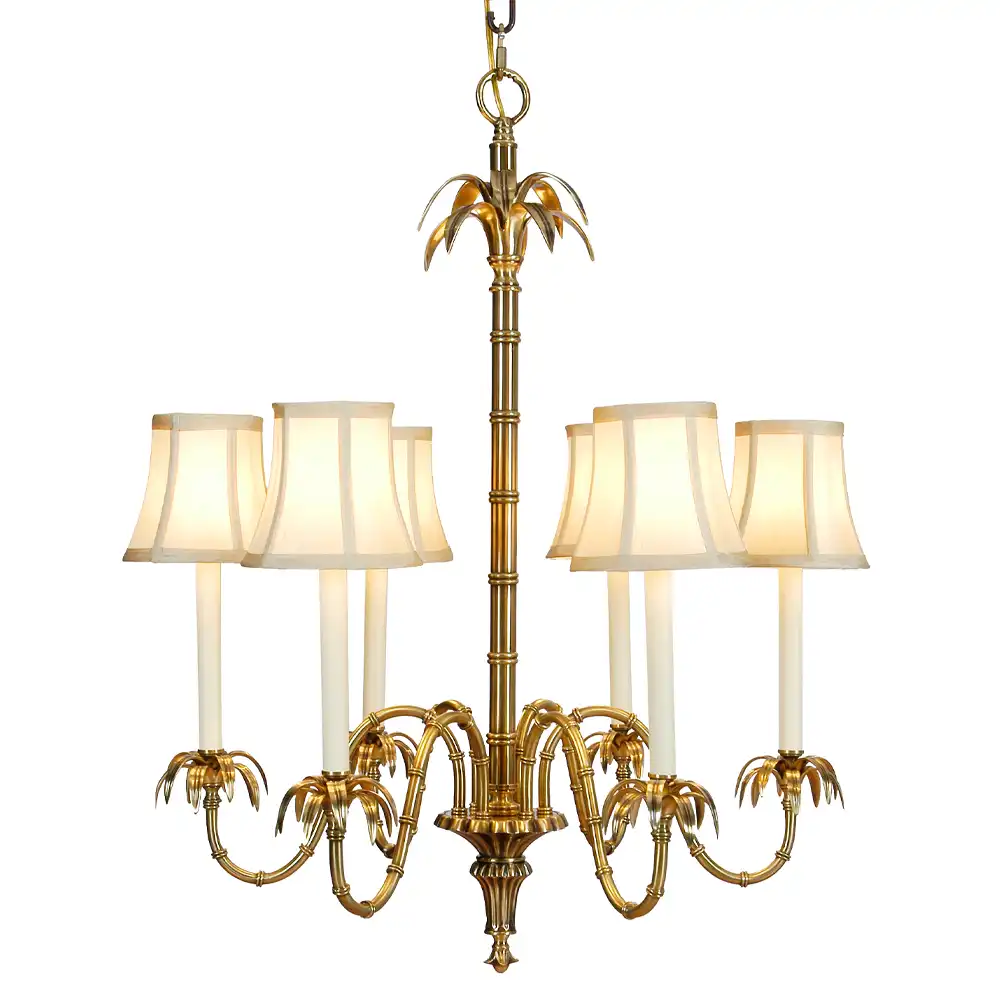 Its sculptural central column, inspired by bamboo stems, rises gracefully to support six elegantly curved arms adorned with stylized palm-leaf accents. Each arm is crowned with a tailored fabric lampshade in soft ivory, diffusing light into a warm, sophisticated glow that enhances any interior space.