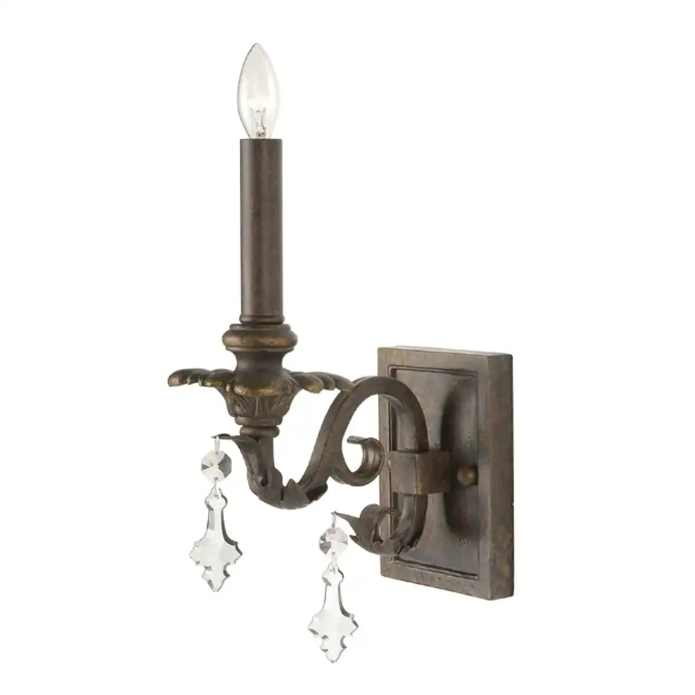 Regal 1-light candle sconce with handcrafted antique bronze finish, a decorative scroll arm, and dazzling crystal drops. Features a classic design for lasting grandeur and sparkling illumination. Perfect for custom projects and wholesale.
