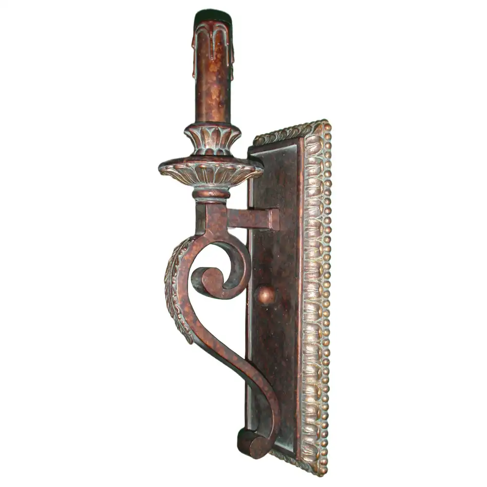 This single-light wall sconce is constructed from robust, high-strength metal, ensuring a stable structure that is built to withstand time and provide long-term compatibility. The distinguished antiqued bronze finish offers a rich, multi-tonal brown with subtle verdigris or gold highlights, providing an authentic, aged appeal that complements classic décor and fine furnishings. This durable finish, combined with the ornate rectangular backplate featuring a detailed border, the gracefully scrolled arm adorned with a leaf motif, and the prominent candle-style light with its decorative bobeche, creates an artistic and luxurious presence. The candle-style light (bulb not included, ideal for candelabra or flame-tip bulbs) provides a soft, inviting illumination, perfect for creating an elegant ambiance.