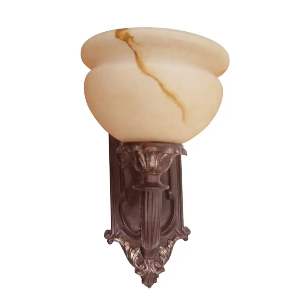 This single-light wall sconce is constructed from robust, high-strength metal, ensuring a stable and sturdy structure that is built to withstand the test of time. The distinguished antique bronze finish, with its rich, distressed texture and profound aged highlights, offers a sophisticated and grand aesthetic. This elegant finish, combined with the elaborately designed backplate featuring classical motifs, fluted columns, and decorative scrolling at the base, creates an artistic and luxurious presence. A single inverted bowl-shaped faux alabaster glass shade rests atop the ornate arm, diffusing light softly upwards, casting an inviting, ambient glow perfect for hallways, formal living areas, bedrooms, or as an elegant accent in any room. The natural-looking veining in the glass adds to its luxurious appeal.