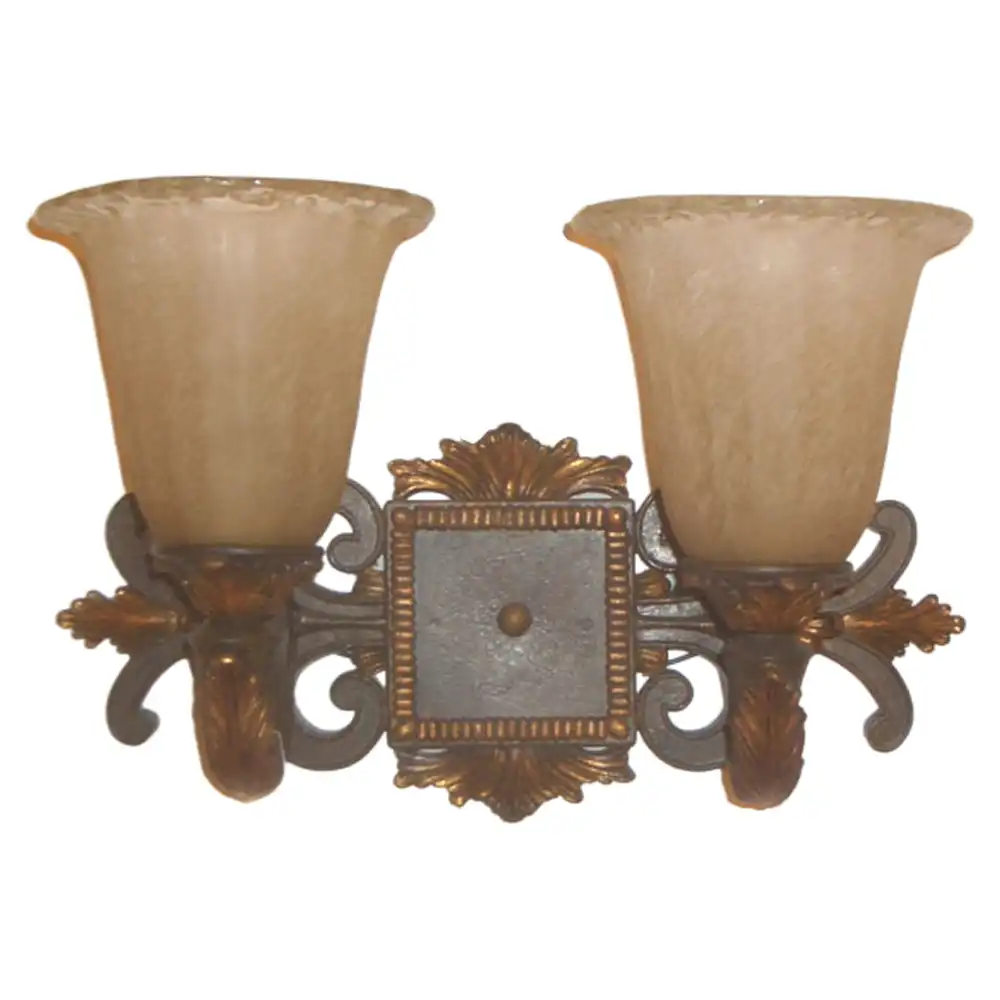 This two-light wall fixture is constructed from robust, high-strength metal, ensuring a stable and sturdy structure that is built to withstand the test of time. The distinguished distressed gold (or antiqued bronze with gold accents) finish offers a rich, opulent tone with subtle aged highlights, providing an authentic and classical aesthetic that complements a wide range of warm color palettes and design schemes. This elegant finish, combined with the elaborately scrolled framework, central decorative backplate, and ornate supporting arms, creates an artistic and commanding presence. Two bell-shaped frosted amber glass shades diffuse light softly and evenly, casting an inviting, ambient glow perfect for vanity areas, providing ample and balanced illumination for daily routines.