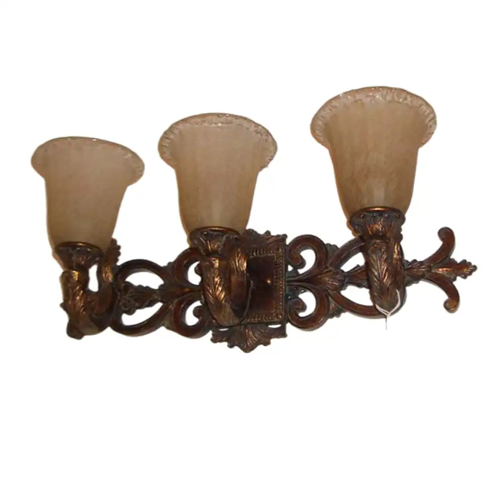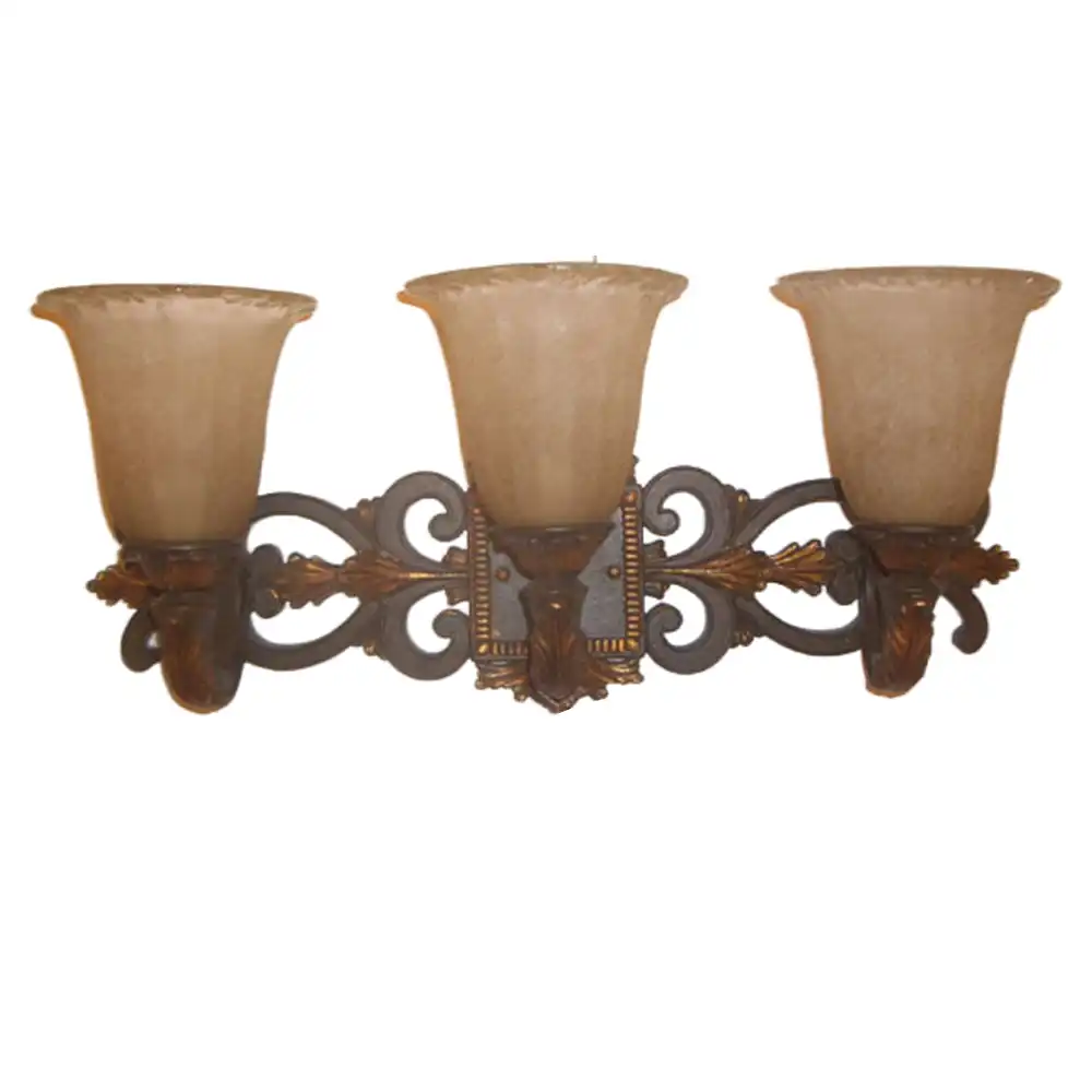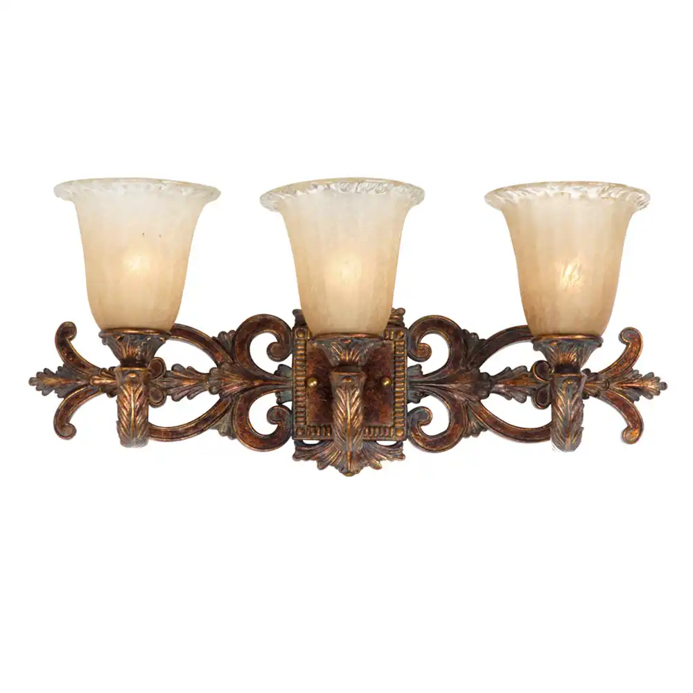 This three-light wall fixture is constructed from robust, high-strength metal, ensuring a stable and sturdy structure that is built to withstand the test of time. The distinguished distressed gold (or antiqued bronze with gold accents) finish offers a rich, opulent tone with subtle aged highlights, providing an authentic and classical aesthetic that complements a wide range of warm color palettes and design schemes. This elegant finish, combined with the elaborately scrolled framework, central decorative backplate, and ornate supporting arms, creates an artistic and commanding presence. Three bell-shaped frosted amber glass shades diffuse light softly and evenly, casting an inviting, ambient glow perfect for vanity areas, providing ample and balanced illumination for daily routines.