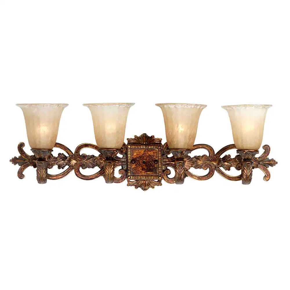 This four-light wall fixture is constructed from robust, high-strength metal, ensuring a stable and sturdy structure that is built to withstand the test of time. The distinguished distressed gold (or antiqued bronze with gold accents) finish offers a rich, opulent tone with subtle aged highlights, providing an authentic and classical aesthetic that complements a wide range of warm color palettes and design schemes. This elegant finish, combined with the elaborately scrolled framework, central decorative backplate, and ornate supporting arms, creates an artistic and commanding presence. Four bell-shaped frosted amber glass shades diffuse light softly and evenly, casting an inviting, ambient glow perfect for vanity areas, providing ample and balanced illumination for daily routines.