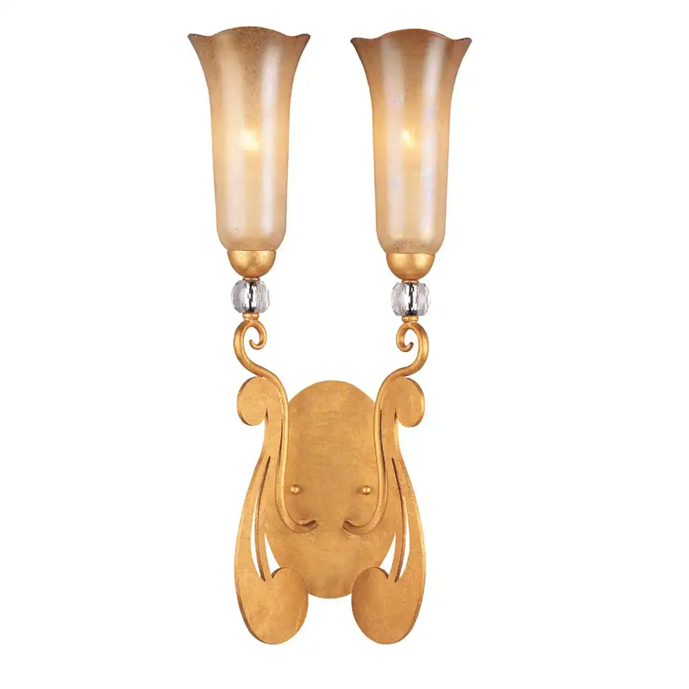 This two-light wall sconce is constructed from robust, high-strength metal, ensuring a stable structure that is built to withstand time and provide long-term compatibility. The distinguished gilded gold leaf finish offers a lustrous, hand-applied gold appearance, providing a luxurious aesthetic that complements classic decor and rich color palettes. This durable finish, combined with the elaborate backplate featuring scrolling “fleur-de-lis” inspired motifs, two dazzling clear crystal accents, and the prominent amber fluted glass shades, creates an artistic and powerful presence. The amber-hued, fluted glass beautifully diffuses the light (bulbs not included), creating a soft, warm, and inviting ambient glow, while the crystals add a touch of refined sparkle, perfect for enhancing a sumptuous and elegant atmosphere.
