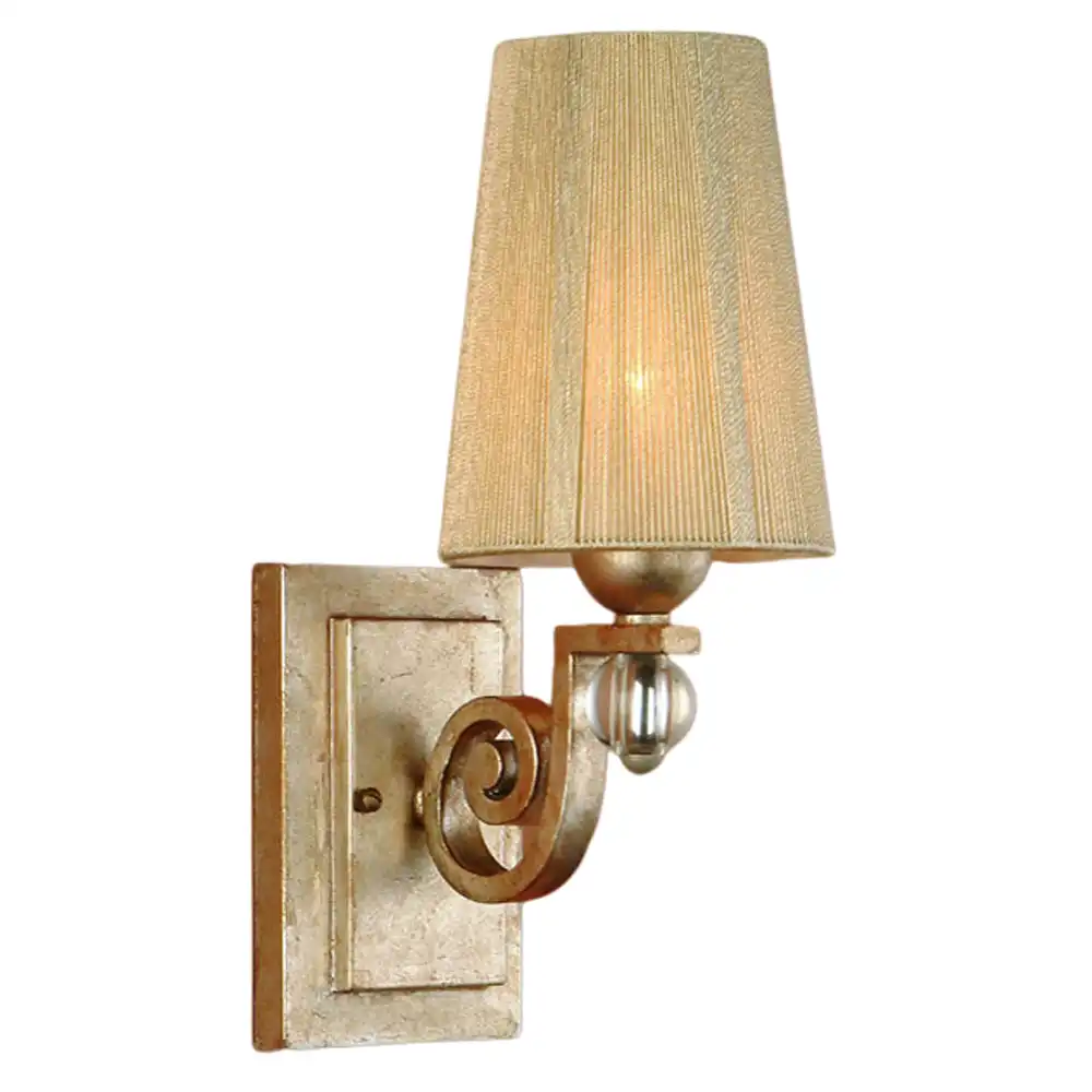 This single-light wall sconce is constructed from robust, high-strength metal, ensuring a stable and sturdy structure that is built to withstand the test of time. The distinguished gilded gold leaf finish offers a rich, luminous, and textured appearance, providing a luxurious aesthetic that complements a wide range of sophisticated interior palettes. This elegant finish, combined with the elegantly framed rectangular backplate, a decorative scroll accent, and a subtle clear crystal sphere detail at the base of the light, creates an artistic and refined presence. A single tall, tapered crème fabric shade, possibly with a delicate pleating or textured weave, diffuses light softly and evenly, creating a warm, ambient glow perfect for hallways, living rooms, bedrooms, or as a chic accent in any space.