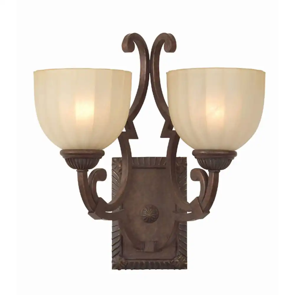 This two-light wall sconce is constructed from robust, high-strength metal, ensuring a stable structure that is built to withstand time and provide long-term compatibility. The distinguished aged bronze finish offers a rich, multi-tonal brown with subtle highlights, providing an authentic, aged appeal that complements classic décor and fine furnishings. This durable finish, combined with the ornate rectangular backplate featuring a detailed border and central starburst motif, the gracefully scrolled and intricate arms, and the prominent ribbed frosted glass shades, creates an artistic and luxurious presence. Each shade beautifully diffuses the light (bulbs not included), creating a soft, inviting illumination, perfect for creating an elegant ambiance without harsh glare.