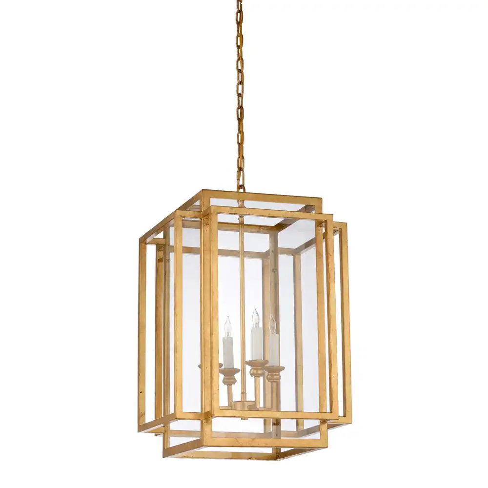 The Regalia 4-Light Geometric Lantern Pendant redefines timeless elegance through the harmony of clean architectural lines and a warm, handcrafted finish. Constructed from high-strength metal, this pendant light features a brushed antique gold finish with a subtle satin luster, creating a sophisticated yet inviting aesthetic. The hand-applied patina lends depth and character to the fixture, highlighting the artisanal quality of each frame.