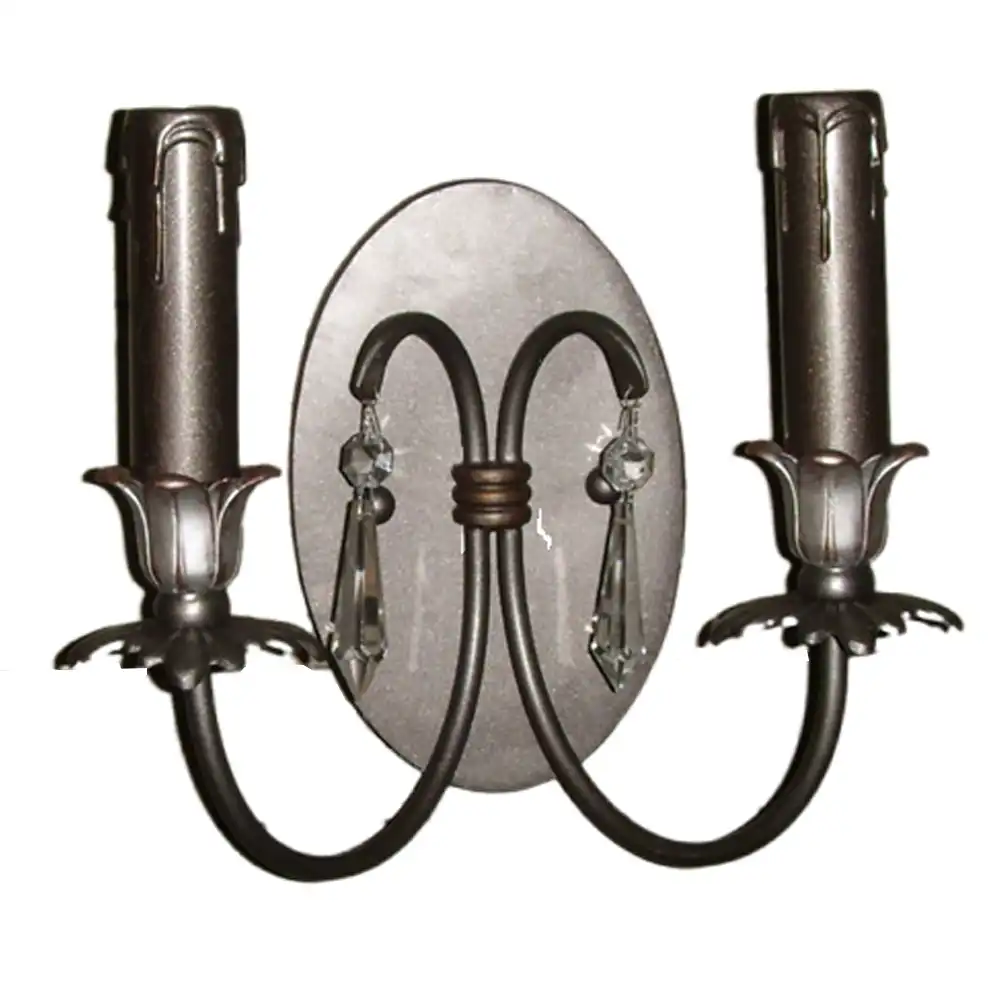 This two-light wall sconce is constructed from robust, high-strength metal, ensuring a stable structure that is built to withstand time and provide long-term compatibility. The distinguished hand-applied distressed iron finish offers a muted, aged metallic appearance with subtle textural variations, providing an authentic, time-worn aesthetic that beautifully complements natural wood, stone accents, and warm color palettes. This durable finish, combined with the classic oval backplate, gracefully curved and intertwined metal arms, decorative bobeches with scalloped edges, and two prominent faux candle covers with drip details (bulbs not included), creates an artistic and welcoming presence. Two clear crystal teardrops are subtly hung from the central metalwork, adding a delicate touch of sparkle and refined luxury. The faux candle covers provide a traditional, cozy ambiance without the need for real candles.