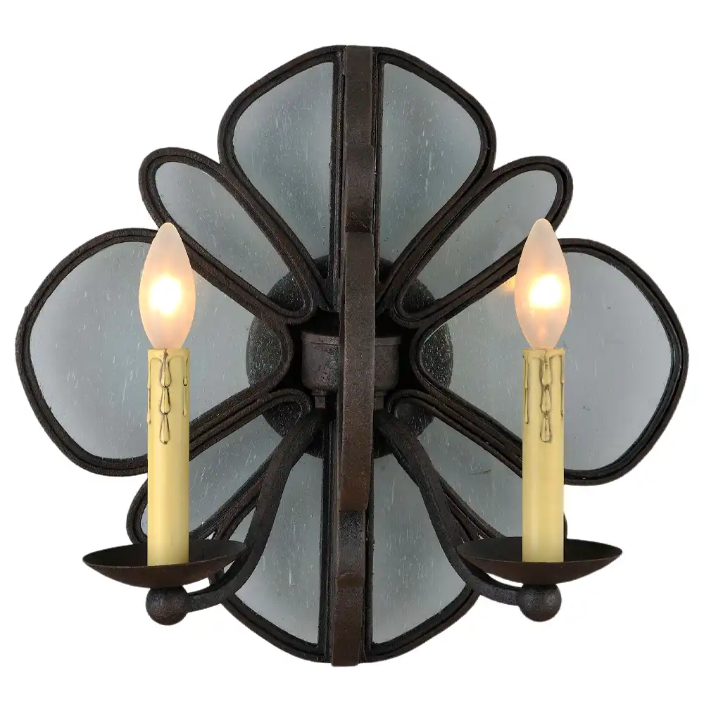 This two-light wall sconce is constructed from robust, high-strength metal, ensuring a stable structure that is built to withstand time and provide long-term compatibility. The distinguished hand-applied distressed iron finish offers a deep, textured appearance with warm, earthy tones and a sense of aged history, beautifully complementing the unique texture of the seedy glass. This durable finish, combined with the ornate stylized floral or bow-like metal frame, multiple clear seedy glass “petals” or segments that radiate outward, and two prominent faux candle covers with drip details (bulbs not included), creates an artistic and powerful presence. The clear seedy glass panels add subtle texture and visual interest, diffusing the light softly, while the faux candle covers provide a traditional, cozy ambiance without the need for real candles, enhancing a grand and stylish atmosphere with refined elegance.