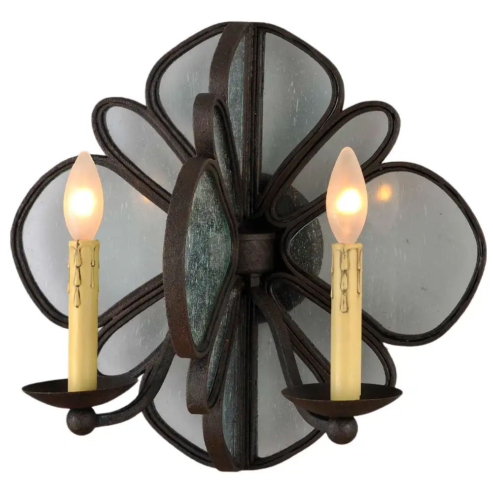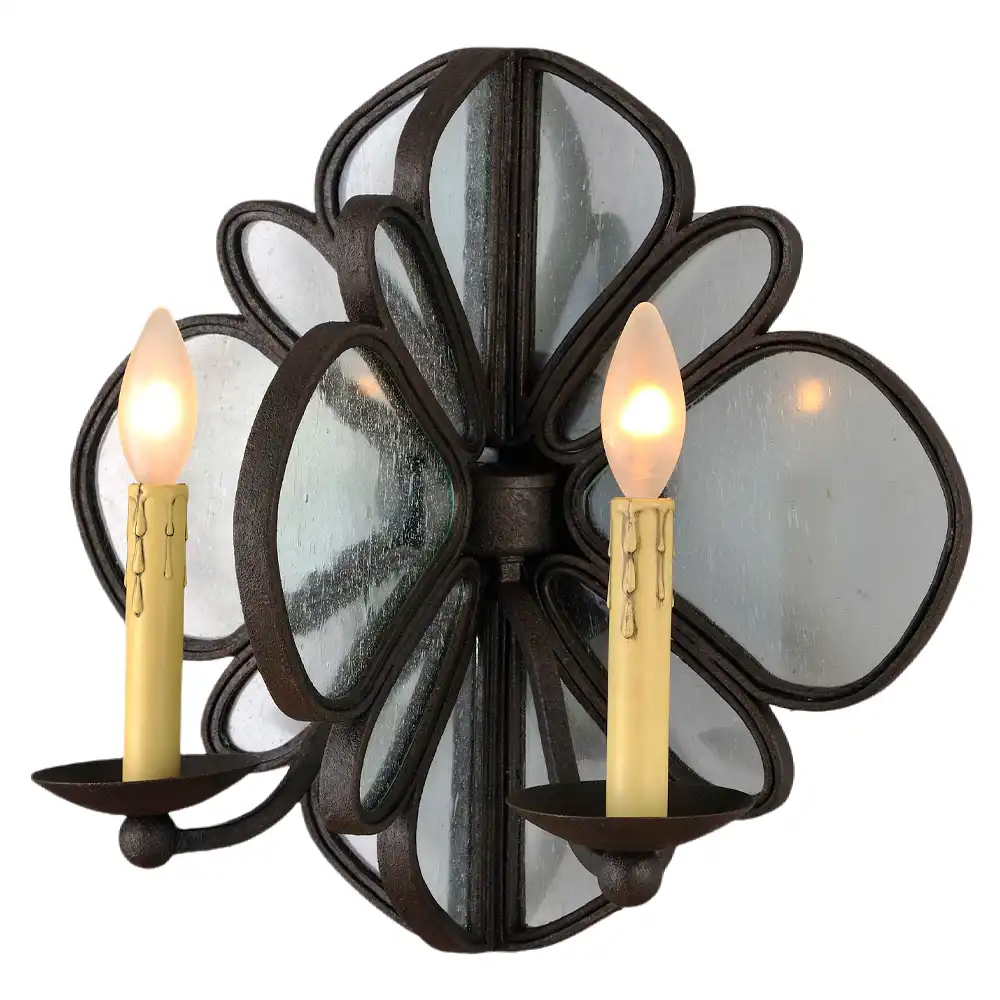 Introduce a touch of artistic elegance and warm, inviting illumination to your interiors with our Rustic Floral Iron & Seedy Glass 2-Light Wall Sconce with Faux Candle Drips. Meticulously handcrafted at our professional decorative light fixture factory in China, this exquisite wall lighting piece embodies a profound understanding of rustic, Craftsman, transitional, and Mediterranean interior design. It seamlessly blends high-strength metal with a rich hand-applied distressed iron finish, unique clear seedy glass “petals,” and two realistic faux candle holders. Designed for enduring beauty, stability, and long-term reliability, it’s an ideal selection for discerning designers and end-users seeking distinctive, artistic, and functionally superior lighting solutions for entryways, living rooms, dining rooms, or any space desiring a sophisticated, character-rich focal point.