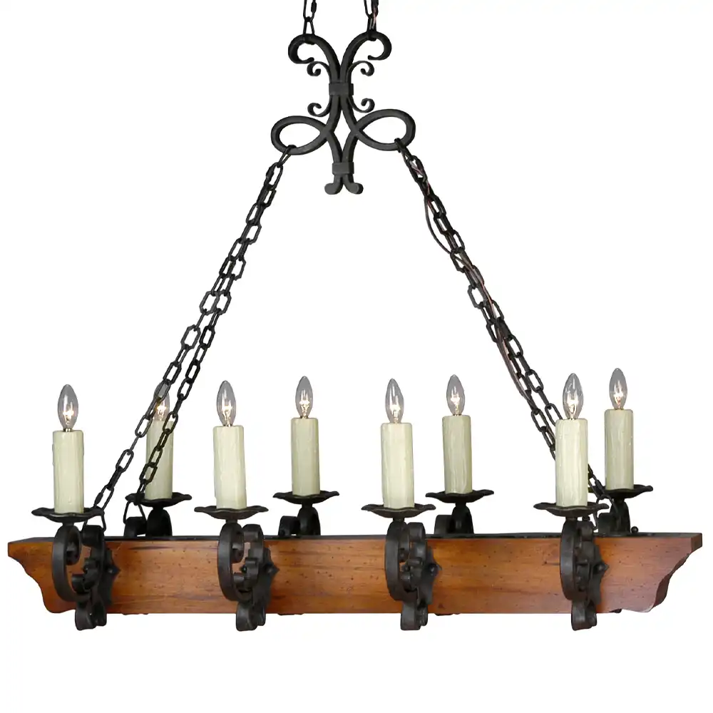 This commanding 8-light fixture is designed with a prominent linear solid wood beam as its core, from which robust, hand-forged iron scrollwork elements extend downwards, serving as the mounts for the light holders. Suspended by heavy-duty chains from a central scrolled iron canopy, the entire structure exudes strength and historical authenticity. Eight precisely spaced light holders are arranged along the wooden beam, each presenting a classic candle-style bulb with a decorative “wax drip” sleeve, for an authentic historical ambiance. The absence of traditional shades allows the warm glow of the bulbs to fully illuminate the natural beauty of the wood and the intricate details of the ironwork, enhancing its artistic and handcrafted appeal.