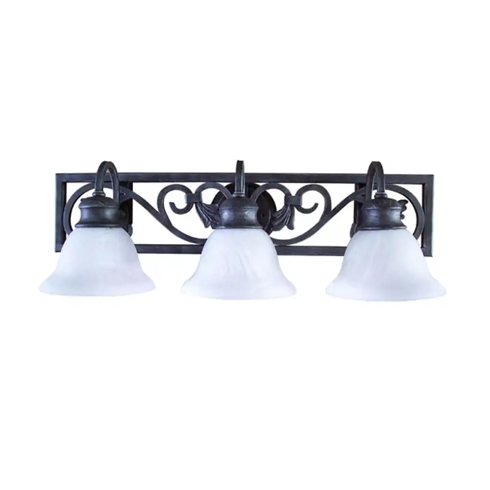 This three-light wall fixture is constructed from high-strength metal, ensuring a stable and robust structure that is built to withstand the test of time. The distinctive dark, weathered iron finish, combined with elegant scrollwork details, offers a charming, antique-inspired aesthetic that beautifully complements traditional, rustic, Tuscan, and even transitional design styles. Each alabaster-style glass shade is designed to diffuse light softly and evenly, creating a warm, ambient glow perfect for vanity areas, hallways, or any space where a touch of classic character is desired.