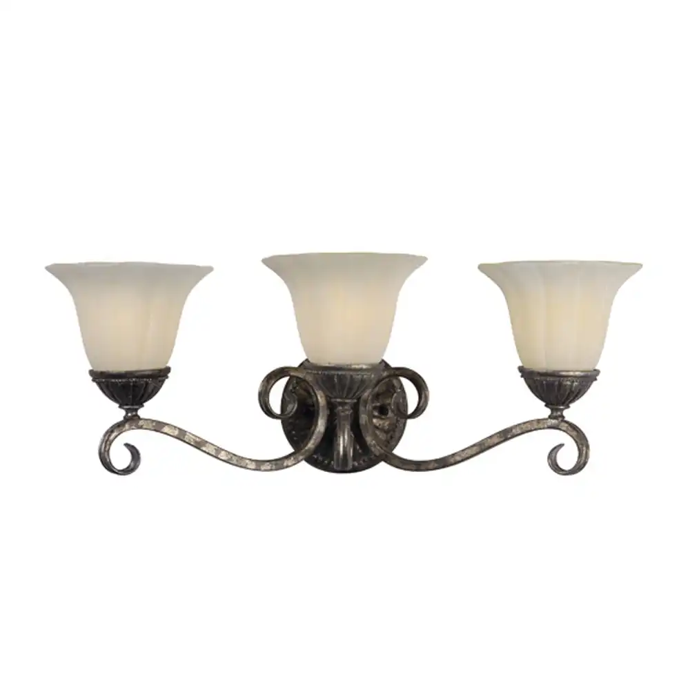This three-light wall fixture is constructed from robust, high-strength metal, ensuring a stable and sturdy structure that is built to withstand the test of time. The distinguished antique pewter (or distressed silver) finish, with its rich, dark tone and subtle aged highlights, offers an authentic and grand aesthetic. This elegant finish, combined with the elaborately designed central backplate featuring intricate scrollwork and decorative motifs, and gracefully curved arms that lead to ornate cup details, creates an artistic and luxurious presence. Three bell-shaped faux alabaster glass shades, which diffuse light softly and warmly, casting an inviting, ambient glow perfect for vanity areas, master bathrooms, or as an accent in hallways. The natural-looking veining in the glass adds to its luxurious appeal.