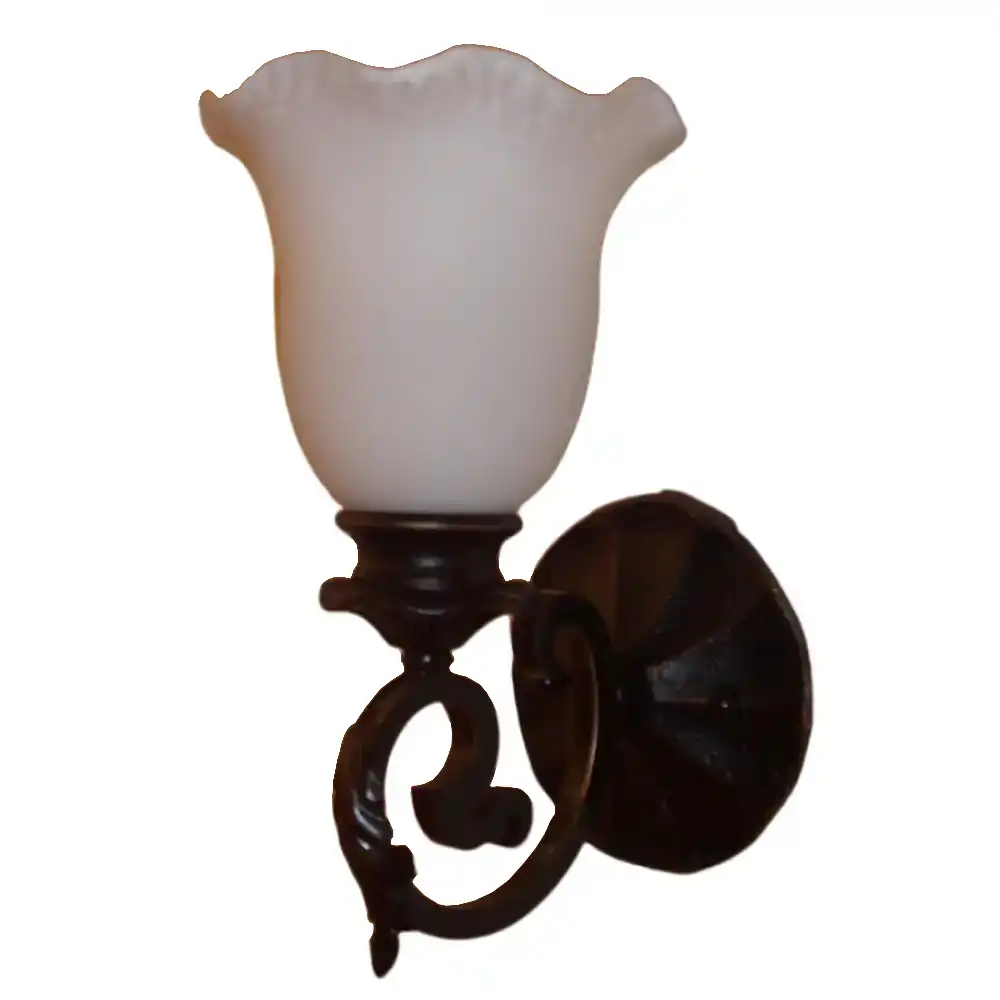 This single-light wall sconce is constructed from robust, high-strength metal, ensuring a stable structure that is built to withstand time and provide long-term compatibility. The distinctive dark bronze/distressed iron finish offers a deep, textured appearance with rustic charm, providing an authentic, time-worn aesthetic that beautifully complements natural wood, stone accents, and warm color palettes. This durable finish, combined with the classic round backplate featuring a subtle textured detail, the artistically scrolled arm, and the prominent frosted, scalloped glass bell shade (bulb not included), creates an artistic and welcoming presence. The beautifully shaped glass shade diffuses the light, creating a soft, luminous, and inviting ambient glow that is perfect for enhancing a cozy and stylish atmosphere.