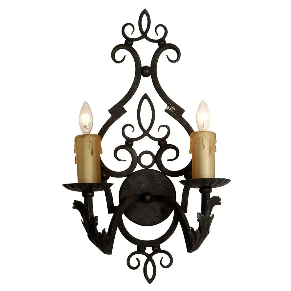 Grand 2-light wall sconce with a handcrafted wrought iron finish, elaborate open scrollwork, and a classic candle-style design with “wax drip” details. Features a rustic Tuscan aesthetic for lasting charm and atmospheric illumination. Perfect for custom projects and wholesale.