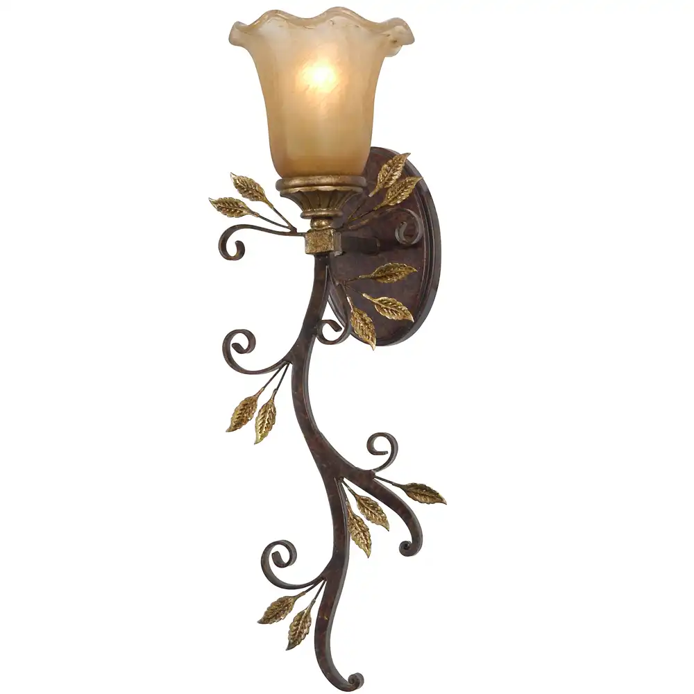 This single-light wall sconce is constructed from robust, high-strength metal, ensuring a stable structure that is built to withstand time and provide long-term compatibility. The distinguished hand-applied bronze finish offers a deep, earthy tone that serves as a perfect base for the delicate, hand-applied gold leaf accents on the numerous leaves, creating a stunning visual contrast. This durable finish, combined with the central ornate oval backplate, the gracefully sculpted vertical vine-like arm adorned with intricate scrollwork and leaf details, and the prominent frosted, scalloped-edge bell-shaped glass shade, creates an artistic and welcoming presence. The frosted glass, with its delicate scalloped rim, beautifully diffuses the light (bulb not included), creating a soft, ambient glow that is perfect for enhancing a serene atmosphere.