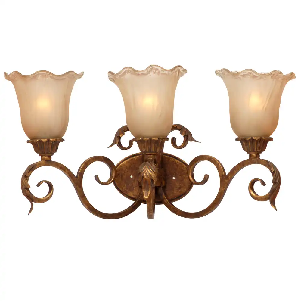 Introduce a touch of expansive rustic artistry and warm, inviting illumination to your interiors with our Rustic Vine Distressed Gold 3-Light Vanity Light with Scalloped Frosted Glass. Meticulously handcrafted at our professional decorative light fixture factory in China, this exquisite wall lighting piece embodies a profound understanding of traditional, Tuscan, rustic, and transitional interior design. It seamlessly blends high-strength metal with a rich hand-applied distressed gold finish, intricate vine-like scrollwork and leaf details, and three beautifully frosted, scalloped-edge bell-shaped glass shades. Designed for enduring beauty, stability, and long-term reliability, it’s an ideal selection for discerning designers and end-users seeking distinctive, artistic, and functionally superior lighting solutions for master bathrooms, spacious powder rooms, or accent lighting over a console table.