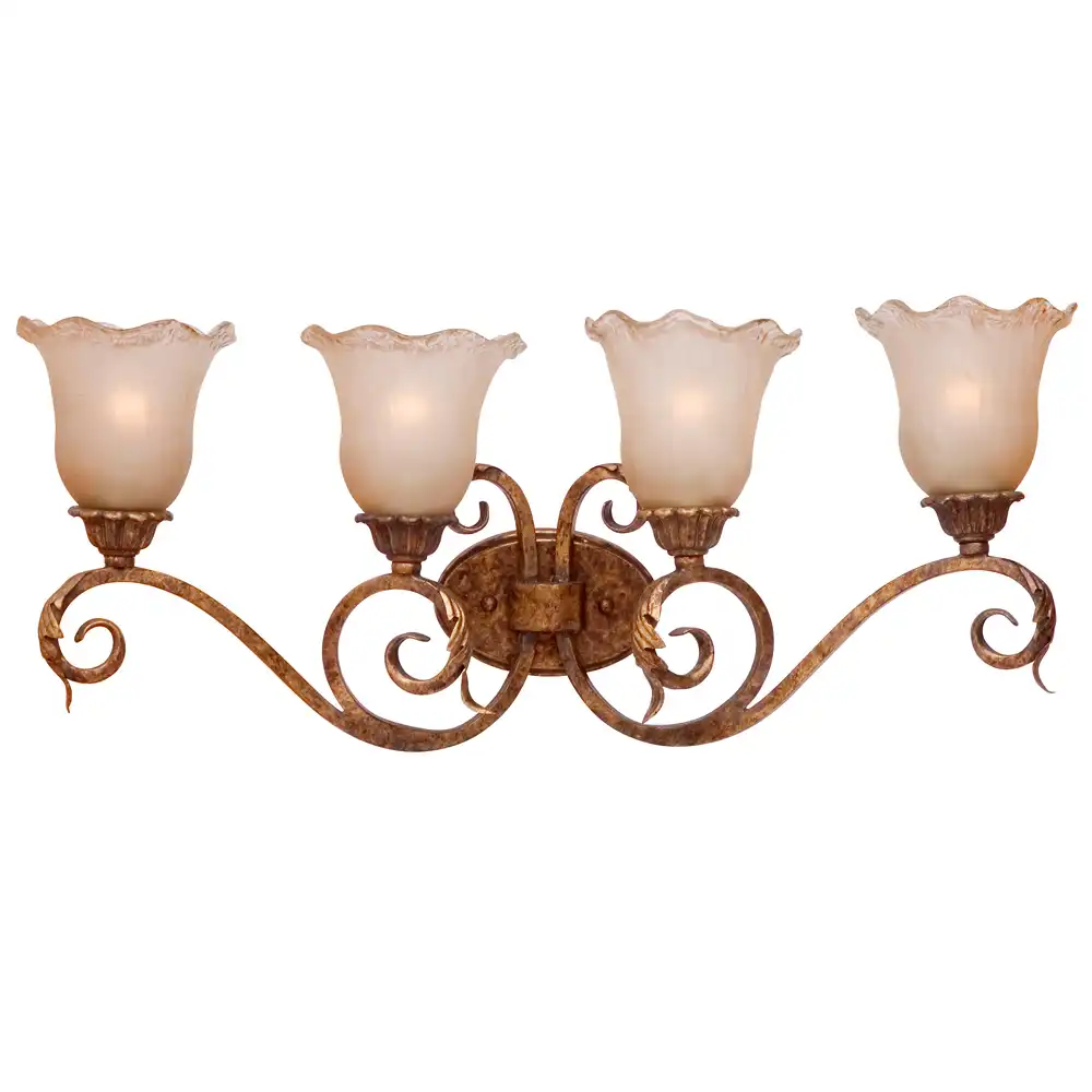 Introduce a touch of expansive rustic artistry and warm, inviting illumination to your interiors with our Rustic Vine Distressed Gold 4-Light Vanity Light with Scalloped Frosted Glass. Meticulously handcrafted at our professional decorative light fixture factory in China, this exquisite wall lighting piece embodies a profound understanding of traditional, Tuscan, rustic, and transitional interior design. It seamlessly blends high-strength metal with a rich hand-applied distressed gold finish, intricate vine-like scrollwork and leaf details, and four beautifully frosted, scalloped-edge bell-shaped glass shades. Designed for enduring beauty, stability, and long-term reliability, it’s an ideal selection for discerning designers and end-users seeking distinctive, artistic, and functionally superior lighting solutions for master bathrooms, spacious powder rooms, or accent lighting over a console table.