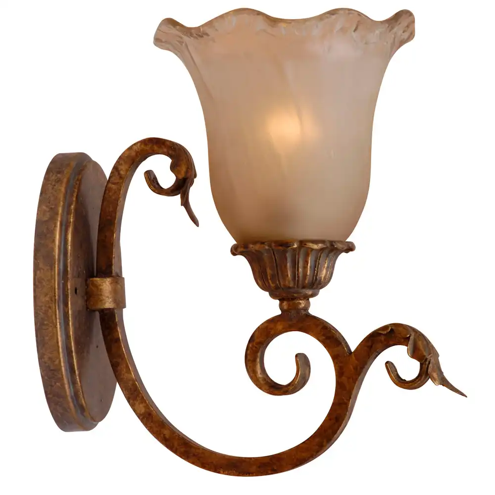 This single-light wall sconce is constructed from robust, high-strength metal, ensuring a stable and sturdy structure that is built to withstand the test of time. The distinguished gilded bronze (or distressed gold with dark accents) finish offers a rich, warm tone with subtle aged highlights and a textured appearance, providing an authentic and classical aesthetic that complements a wide range of rustic and traditional color palettes and design schemes. This elegant finish, combined with the dramatically sweeping and intricately scrolled metal framework, reminiscent of a blossoming vine, creates an artistic and captivating presence. A single inverted bell-shaped glass shade, featuring a beautiful frosted amber (or mottled cream) texture with a softly fluted rim, diffuses light softly and evenly, creating a warm, ambient glow perfect for hallways, living rooms, bedrooms, or as a charming accent in any space seeking a blend of rustic elegance and inviting light.