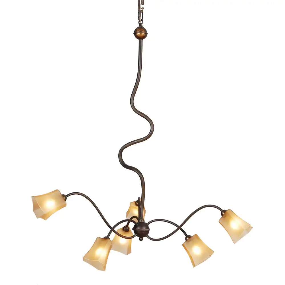 Its six gracefully curved arms flow outward in fluid, vine-like lines, each supporting a soft amber-tinted glass shade shaped like a blooming flower. The shades diffuse the light beautifully, creating a warm and inviting glow that enhances dining rooms, lounges, and boutique interiors with an air of understated sophistication.