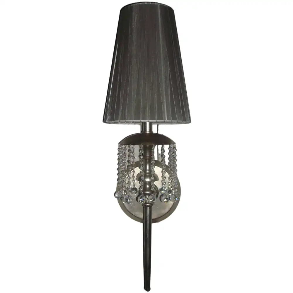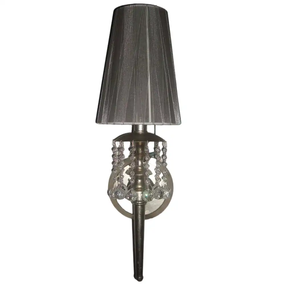 This single-light wall sconce is constructed from robust, high-strength metal, ensuring a stable structure that is built to withstand time and provide long-term compatibility. The sophisticated brushed nickel or antique silver finish (depending on preferred interpretation) offers a muted, yet elegant metallic sheen that complements a wide range of modern and classic decor palettes. This durable finish, combined with the classic round backplate, the elongated central stem, the intricate hanging crystal bead clusters, and the elegant pleated gray fabric cone shade, creates a striking and versatile presence. The subtle texture of the gray shade beautifully filters the light (bulb not included), creating a soft, warm, and inviting ambient glow, while the shimmering crystal beads add a captivating sparkle, perfect for enhancing a serene and stylish atmosphere with a touch of refined luxury.