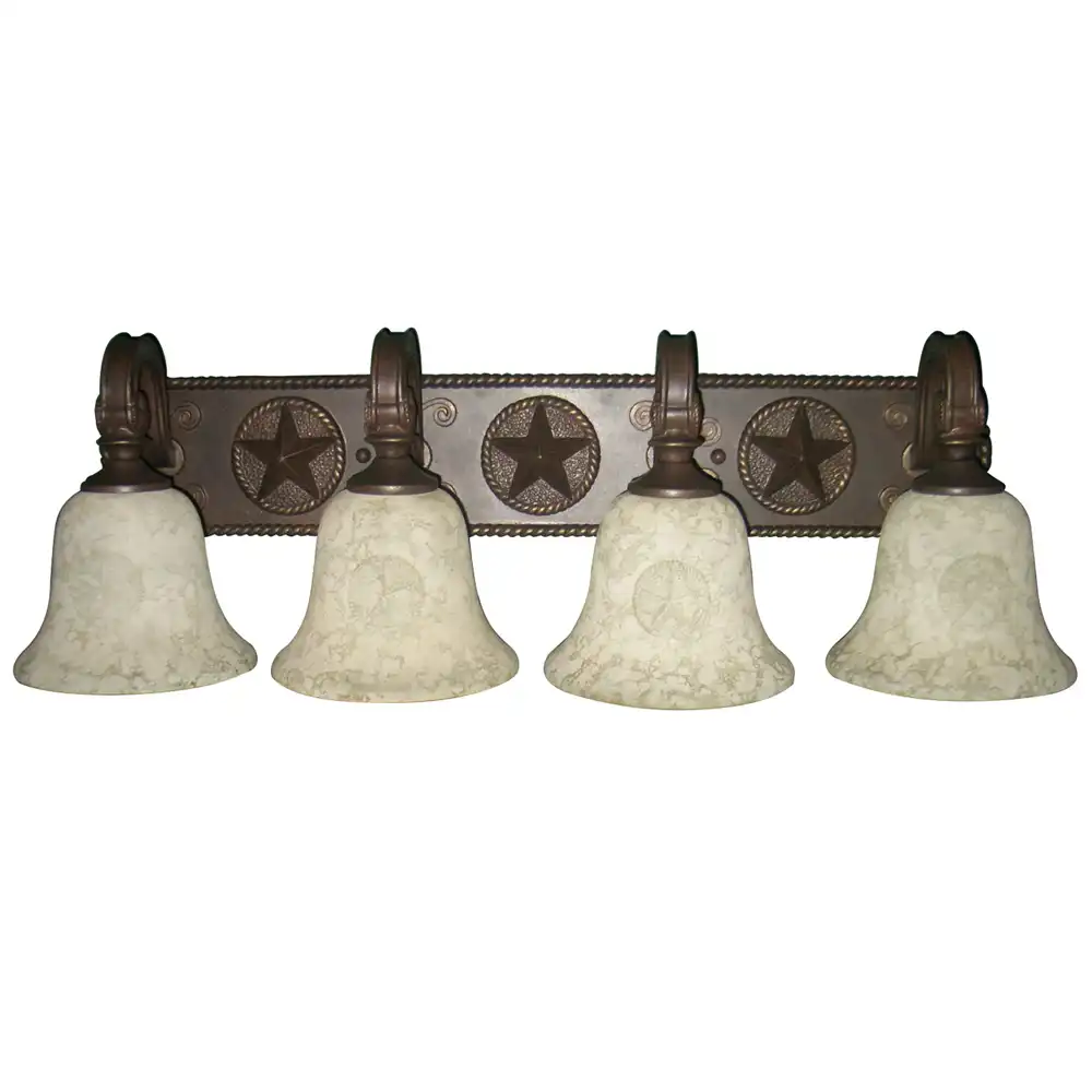 Introduce a touch of rugged charm and ample, inviting illumination to your interiors with our Texas Star Ranch Bronze 4-Light Vanity Sconce with Alabaster Bell Shades. Meticulously handcrafted at our professional decorative light fixture factory in China, this exquisite wall lighting piece embodies a profound understanding of rustic, farmhouse, Western, and lodge-style interior design. It seamlessly blends high-strength metal with a rich hand-applied distressed bronze finish, a distinctive backplate adorned with embossed stars and rope detailing, and four alabaster-style frosted glass bell shades. Designed for enduring beauty, stability, and long-term reliability, it’s an ideal selection for discerning designers and end-users seeking distinctive, artistic, and functionally superior lighting solutions for bathrooms, powder rooms, or any space desiring a bold, characterful accent.