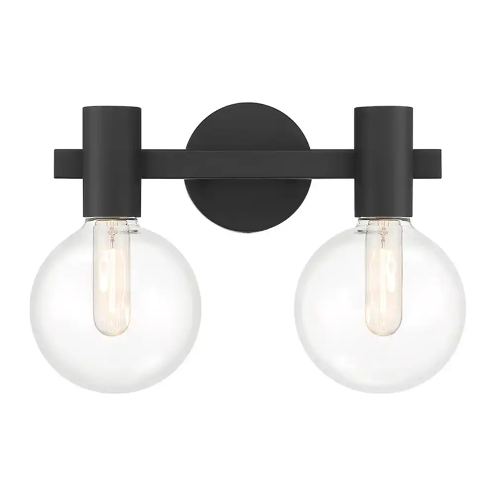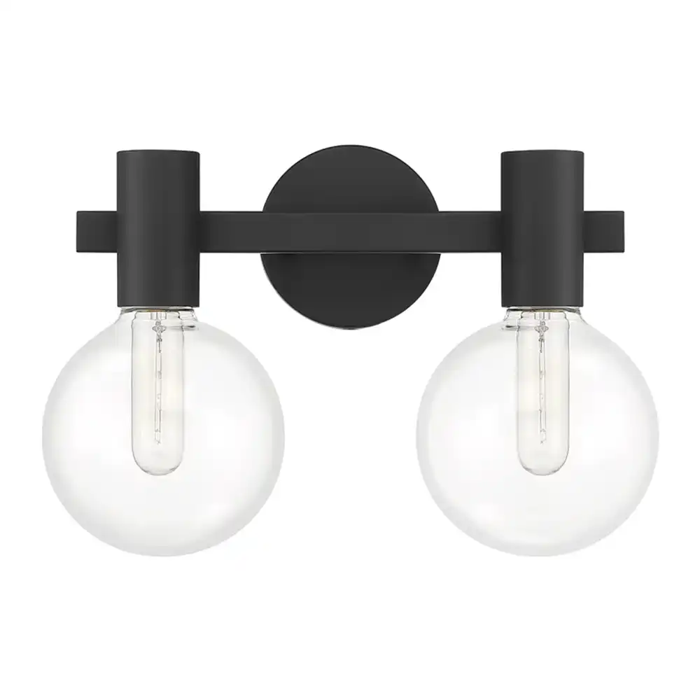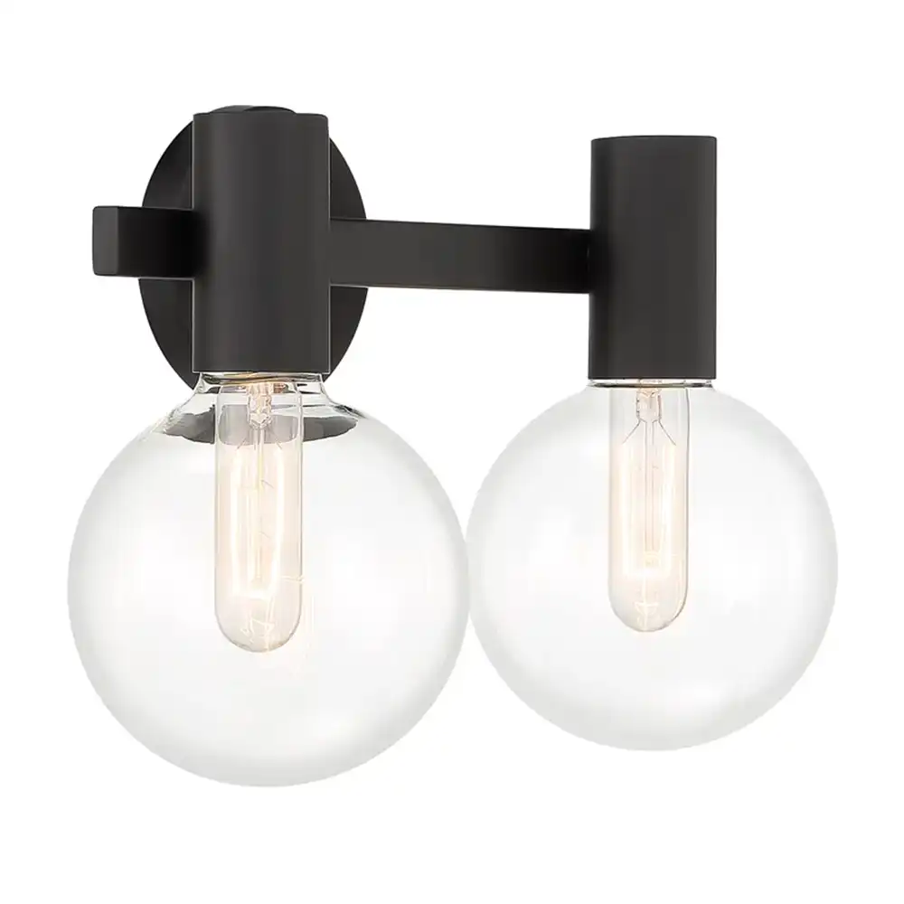 Materials & Finish: The robust and impactful structure of this wall light is skillfully fashioned entirely from premium-grade metal, specifically solid steel, chosen for its inherent strength, stability, and ability to hold a flawless finish. The fixture boasts a sophisticated matte black finish throughout its entire metal framework – from the circular backplate to the rectilinear horizontal bar and the distinctive perpendicular vertical elements. This cohesive, non-reflective black provides a contemporary, understated elegance that is highly versatile and complements a wide range of modern, minimalist, and industrial décor palettes. Two perfectly spherical clear glass globe shades encase the bulbs, allowing for maximum light output and beautifully showcasing the aesthetic of exposed filament bulbs (not included) for an authentic, radiant ambiance. The transparent orbs create an open, airy feel, allowing light to disperse freely and brightly.