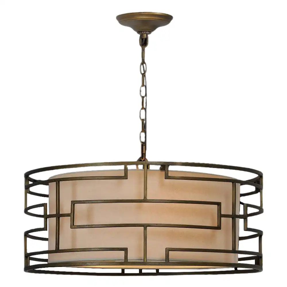 The pendant’s defining feature is its distinctive outer cage, composed of a bold, intersecting geometric pattern reminiscent of Art Deco design or an intricate labyrinth. This intricate metalwork is finished in a sophisticated distressed antique brass or aged gold finish. This warm, subdued golden tone with subtle darker distressing provides an authentic, artisanal, and slightly weathered look, adding character without being overly ornate. Encased within this captivating metal shell is a classic cream or off-white fabric drum shade, which diffuses the four internal lights softly and evenly, creating a warm, inviting glow that permeates the room and highlights the fascinating shadow play of the outer geometric frame.