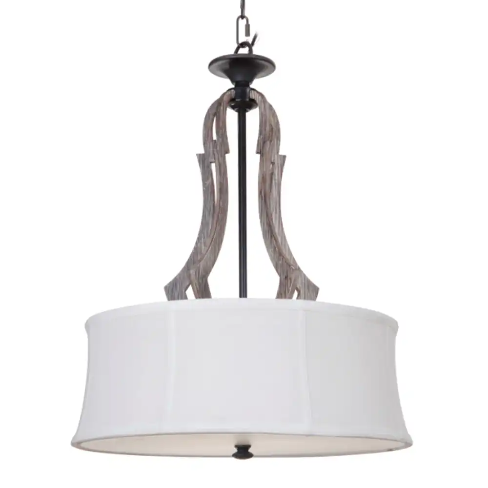 A substantial drum shade, fabricated from premium white fabric, diffuses the light from three bulbs, casting a soft, inviting glow that enhances ambiance without glare. The shade’s clean lines provide a sophisticated contrast to the more intricate top structure. Designed for discerning clients and projects, the “Artisan Loft” pendant promises not only illuminating functionality but also a significant decorative statement.
