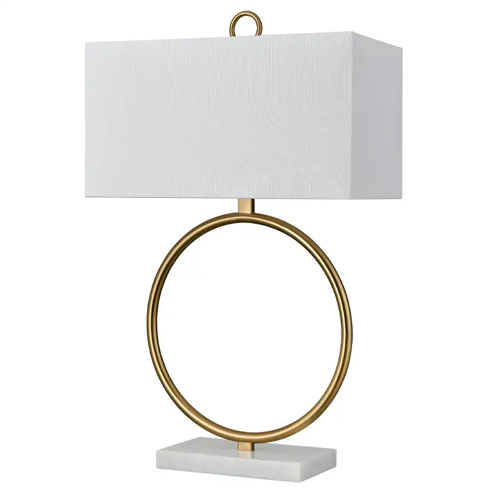 At its core, the lamp features a striking high-strength metal frame, engineered for stability and longevity. Its distinctive circular silhouette, finished in a lustrous brushed brass, exudes a warm, inviting glow, while the crisp, rectangular white fabric shade diffuses light beautifully, creating a soft and inviting atmosphere. The lamp is firmly anchored by a solid natural marble base, adding a touch of classic luxury and ensuring unwavering stability. This combination of premium materials not only guarantees a durable product but also offers a versatile aesthetic that complements a wide range of decor styles from minimalist to classic contemporary.