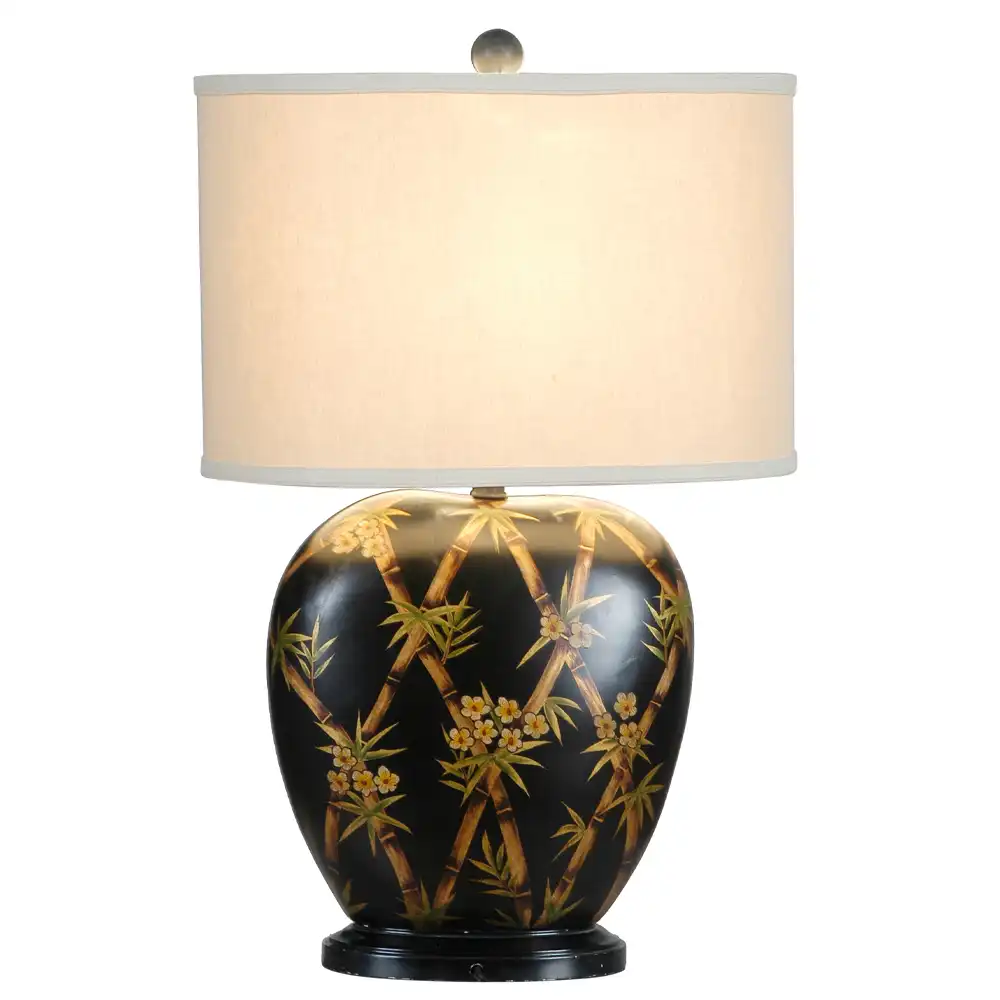 Meticulously constructed, this table lamp features a robust structure that combines high-strength metal with a beautifully hand-painted ceramic or resin body, ensuring exceptional stability and enduring quality for long-term use. The lamp’s distinctive base is sculpted in a classic jar silhouette, creating a graceful, rounded form that harks back to traditional Chinese porcelain. The body is adorned with intricate hand-painted motifs: a dark, lustrous background provides the perfect canvas for a vibrant trellis of golden bamboo stalks and delicate, blooming white or yellow flowers. This detailed artistry transforms the lamp into a true work of art, showcasing meticulous craftsmanship and cultural richness.