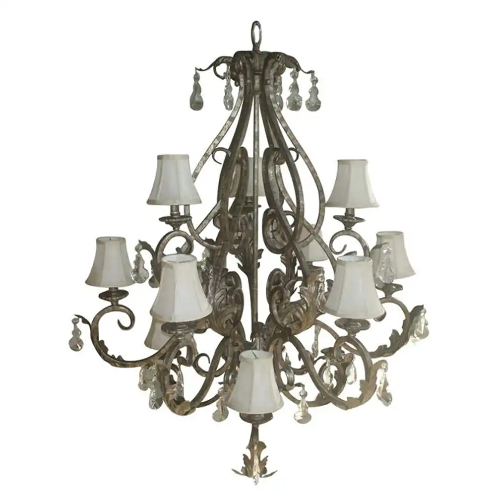 Introduce an air of palatial grandeur and intricate artistry with the “Baroque Cascade” 12-Light Argento Chandelier. This magnificent three-tiered fixture is adorned with a captivating Argento finish, precisely characterized by a heavily textured, distressed silver-gray base with subtle hints of charcoal and soft gold patination, creating a weathered, antique mercury glass effect. The finish is expertly hand-applied to emphasize the elaborate scrollwork and botanical motifs, giving each piece a unique, aged character and profound visual depth. Complementing this luxurious metalwork are strategically placed clear, faceted crystal accents that capture and refract light, adding a touch of timeless sparkle.