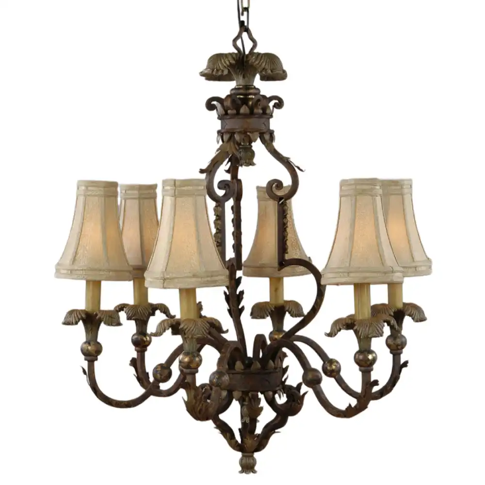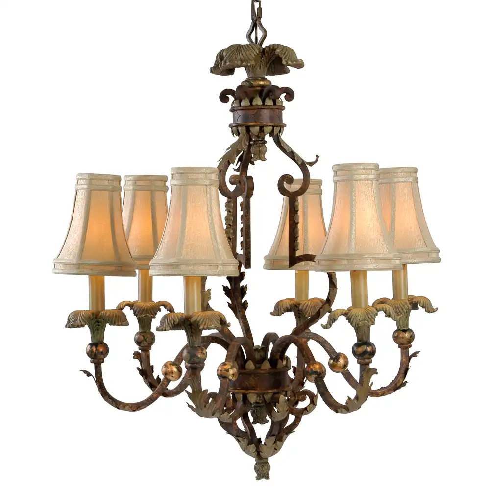 Introduce a touch of old-world charm and intricate beauty with the “Baroque Flora” 6-Light Chandelier, a handcrafted masterpiece designed for traditional, transitional, and luxurious classical interiors. The robust metal framework of this chandelier is meticulously finished in a multi-layered antique bronze or aged gold leaf. This exquisite finish is characterized by its deep, rustic brown base with prominent, brushed gold or coppery highlights and subtle green or verdigris accents on the decorative leaf motifs and sculpted details, creating a rich, historical patina that evokes a sense of enduring elegance.