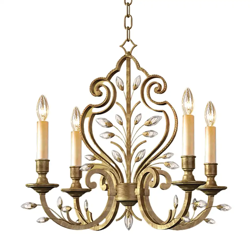 Infuse any space with enchanting warmth and delicate artistry with the “Botanica Lumina” 4-Light Bespoke Chandelier. This exquisite fixture, meticulously handcrafted from high-strength metal, features a captivating aged gold finish. This finish showcases rich, burnished gold tones with subtle dark patinas, creating an authentic, time-worn elegance that harks back to classic design aesthetics. Its charming, compact frame is adorned with intricate scrolled metalwork, beautifully mimicking organic vines and leaves, further enhanced by sparkling clear crystal elements shaped like tender buds and dew drops. Four gracefully positioned candle-style lights, designed to emit a soft, inviting glow, complete this romantic and visually harmonious design.