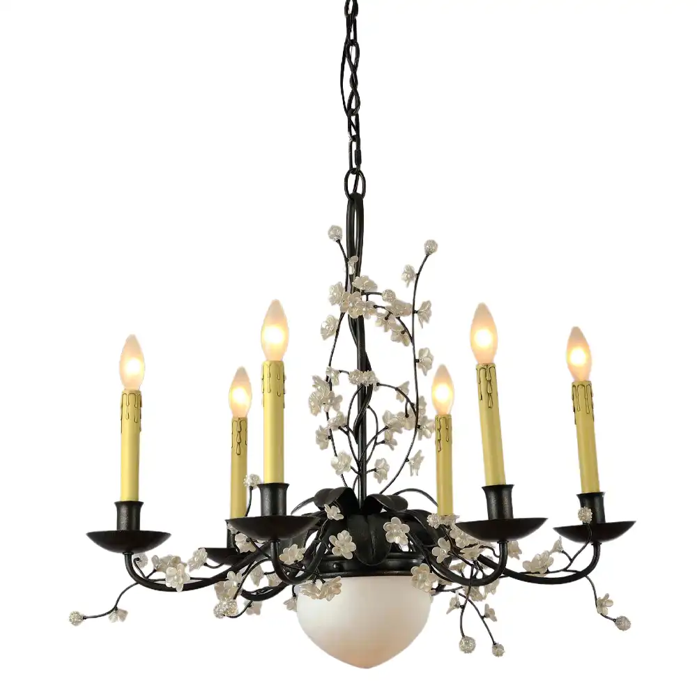 Infuse any space with enchanting beauty and a multi-layered glow with the “Botanical Elegance” 7-Light Bespoke Chandelier. This exquisite fixture, meticulously handcrafted from high-strength metal, features a sophisticated matte black or deep bronze finish. This rich, dark finish provides a refined foundation, allowing the intricate botanical details to truly shine. Six gracefully curved arms extend outwards, each supporting a classic candle-style light that provides a warm, inviting glow. Beneath this array, a central opaque off-white or alabaster-toned glass shade encases an additional light source, offering a soft, diffused ambient light. The chandelier’s central structure is artfully adorned with intricate metal branches, from which a profusion of delicate, clear or frosted crystal/glass “blossoms” emerge, creating a captivating illusion of an illuminated floral cluster. This artistic detailing captures and refracts light, adding a sparkling, ethereal dimension to its design.