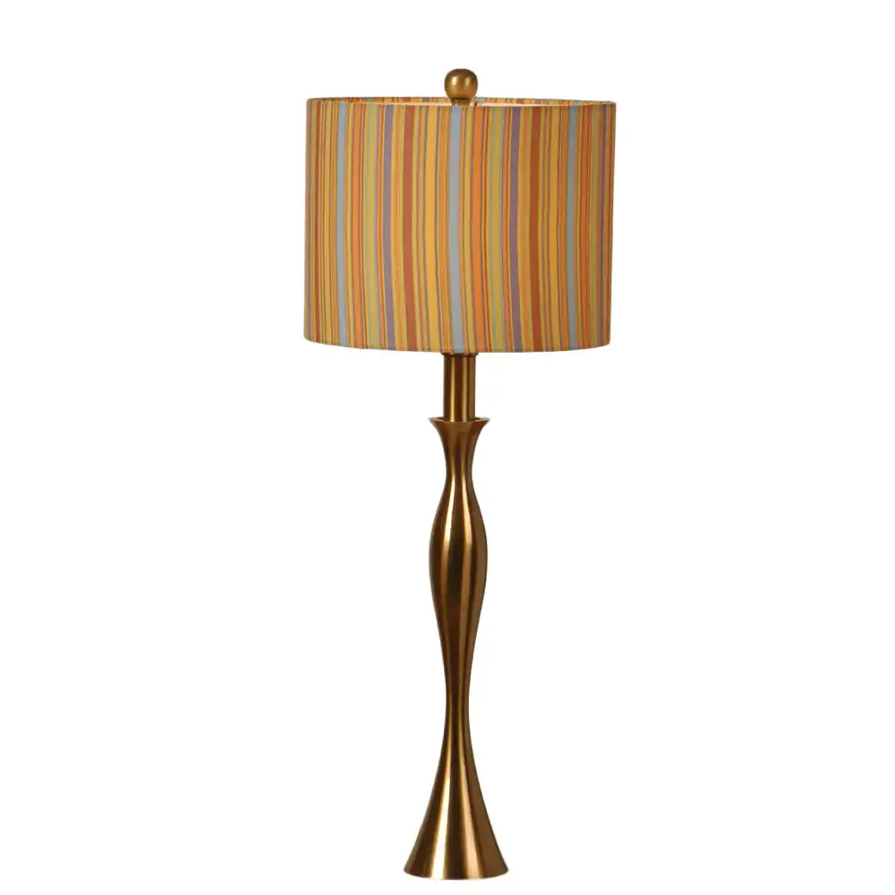 - Vibrant Striped Shade: Distinctive drum shade with a lively vertical stripe pattern in gold, yellow, blue, and lavender.