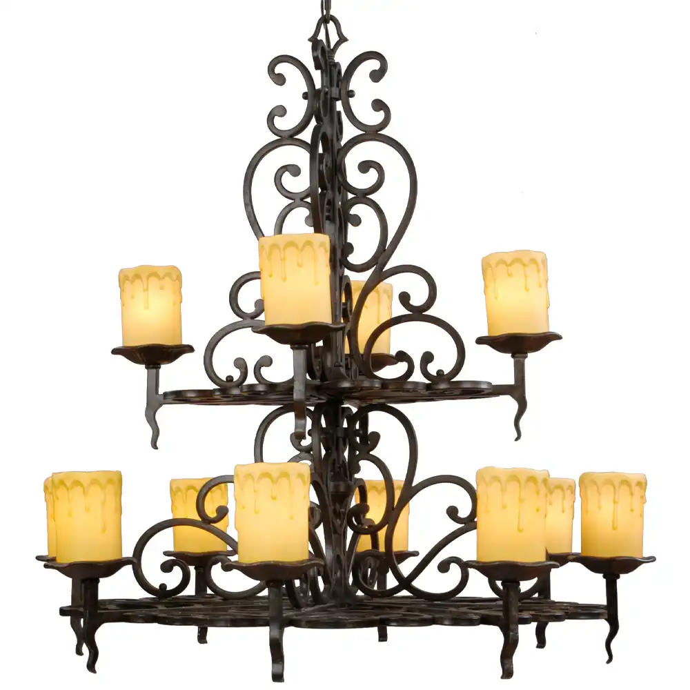 Evoking the robust charm and timeless elegance of old-world design, the “Castillo Luminoso” 2-Tier 12-Light Bespoke Chandelier is a magnificent statement piece designed for interiors that celebrate a rich, artisanal aesthetic. This exceptional fixture, meticulously handcrafted from high-strength metal, features a distinctive forged iron or distressed dark bronze finish. This finish is characterized by its deep, matte black/brown tones, often with a subtle, textured appearance that mimics hand-worked metal, imparting an authentic, rustic-yet-refined character. Its impressive two-tier structure, with four robust candle-style light holders on the upper tier and eight on the lower, showcases elaborate scrolled metalwork, reminiscent of classic wrought iron craftsmanship. Each light holder presents a realistic, flickering LED candle-style bulb, creating a warm, inviting, and utterly captivating illumination that is both evocative and energy-efficient.