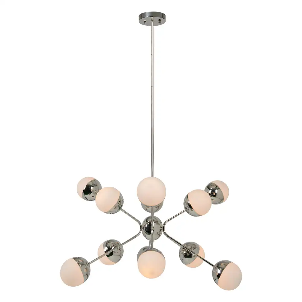 This handcrafted pendant is engineered from high-strength metal, ensuring a remarkably stable structure and enduring performance for long-term installation in grand commercial and sophisticated residential environments. Its distinctive 2-tier “Sputnik” inspired design emanates from a central core, with six precisely welded “V”-shaped stems extending outwards, creating a dynamic, starburst silhouette. Each end of these stems culminates in a light holder, adorned with a combination of frosted and polished spherical elements, providing a total of 12 lights that cast a soft, ambient glow. The precise curvature (radians) of the “V”-shaped stems, integrating seamlessly with the central metal ball, showcases exceptional craftsmanship.