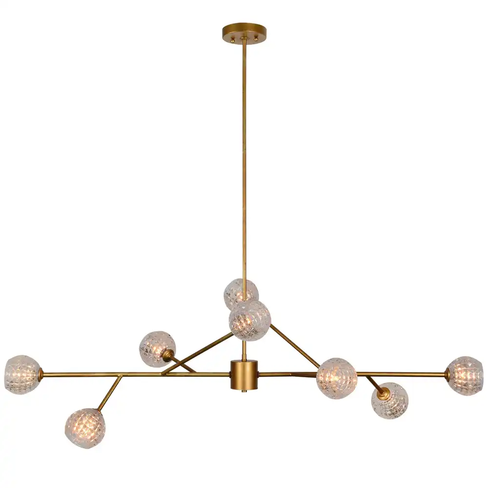 A stunning 8-light linear chandelier with a satin brass finish, featuring a dynamic branch design and clear faceted glass globes. Handcrafted for modern interiors; fully customizable for OEM/ODM/B2B.