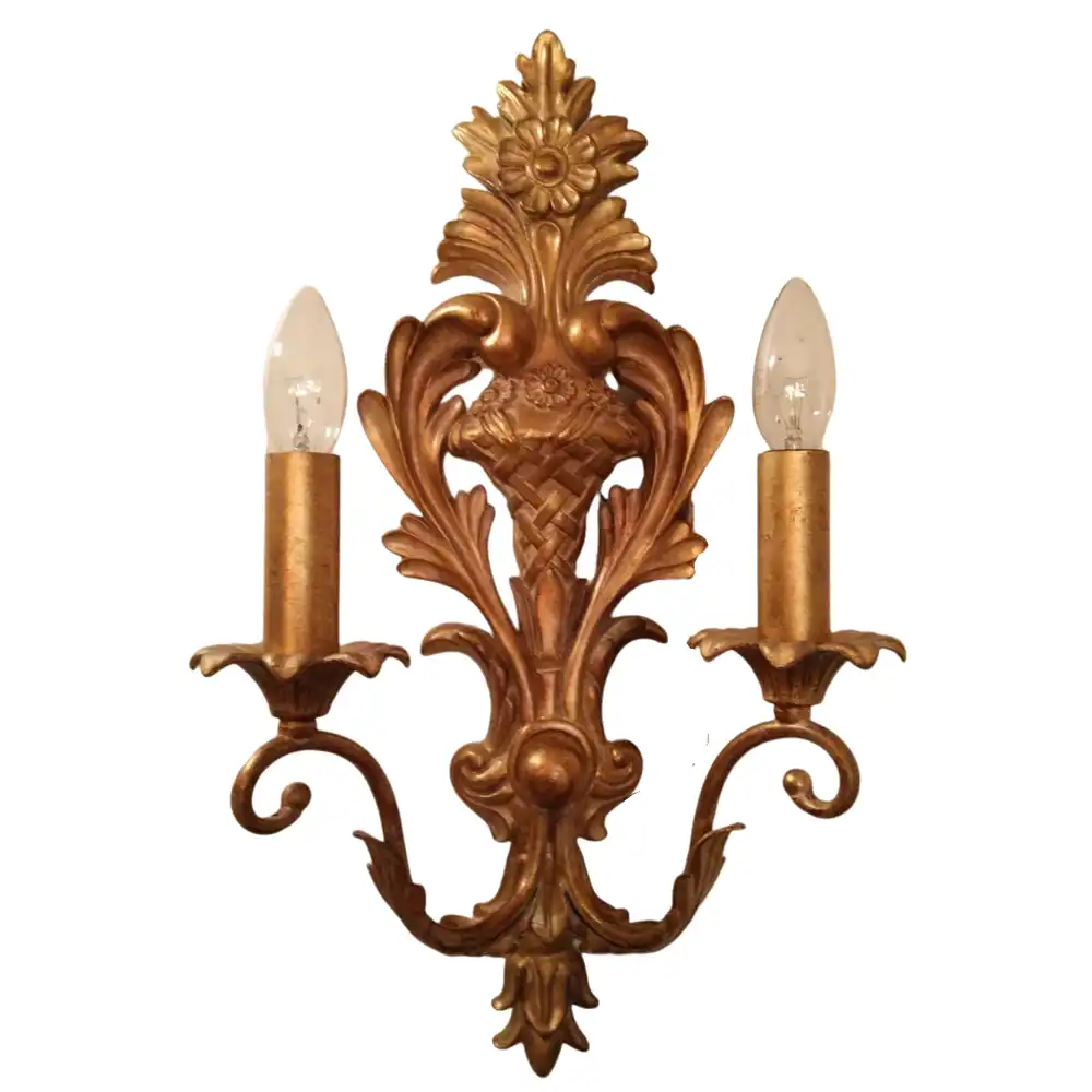 Constructed from high-strength metal, its stable structure ensures exceptional durability and reliable performance, compatible with long-term use in both residential and high-end commercial applications. The elaborate central backplate, adorned with finely detailed floral motifs, leaves, and scrolls, gracefully extends into two curved arms that support candle-style bulbs within elegant sleeves. This meticulous craftsmanship reflects a profound understanding of historical decorative artistry and a dedication to achieving breathtaking aesthetic impact through intricate detail and premium materials. The two lights provide a balanced, inviting glow, perfect for creating ambient lighting that enhances the overall elegance and warmth of a room.