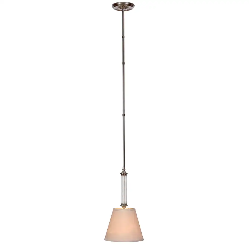 The pendant’s distinguished finish is a polished nickel, characterized by its mirror-like reflectivity and brilliant, cool silver-tone luster. This pristine, highly reflective surface radiates a crisp sophistication, enhancing the fixture’s clean lines and modern aesthetic. The central stem descends gracefully, featuring a clear, fluted glass accent that adds a touch of classic detail and refracts light subtly, leading down to a tapered fabric shade. This off-white, conical shade gently diffuses the light, creating a warm and inviting glow that is both functional and atmospheric.