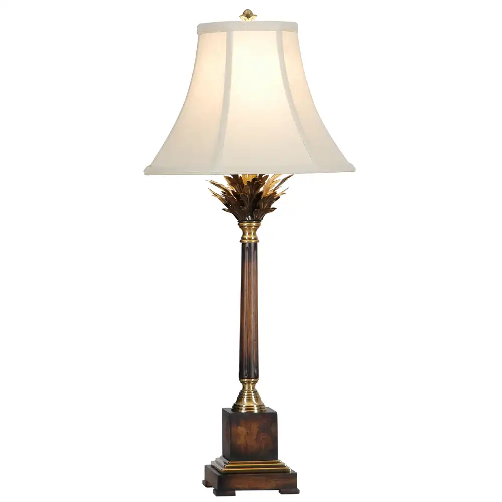 Atop the wooden column, a burst of intricately detailed metal fronds, finished in a rich antique brass, beautifully supports the light fitting. This “canopy” of metallic leaves adds a unique organic flourish, reminiscent of exotic foliage, seamlessly blending with the lamp’s sophisticated design. The antique brass finish on the fronds and base accents deepens the lamp’s luxurious appeal.