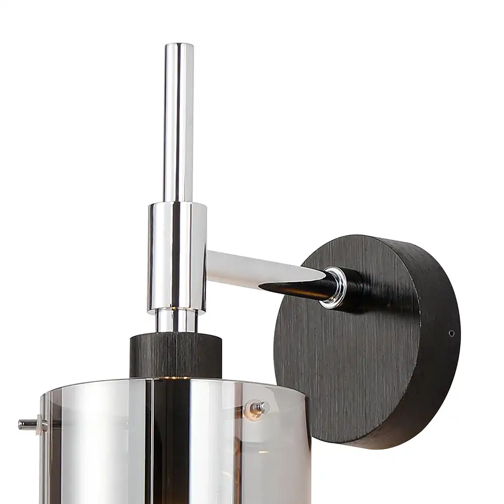 Luxurious 1-light wall sconce with a matte black metal backplate, polished chrome arm, and a striking metallic smoked glass cylindrical shade. Handcrafted from high-strength metal for durability and a modern, geometric design. Customizable for wholesale and OEM/ODM.