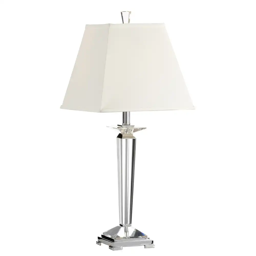 Crowning this opulent base is a crisp, clean square or rectangular lampshade, crafted from a premium, smooth fabric like linen or silk blend in a soft, neutral tone like off-white or light cream. This thoughtful pairing ensures a beautifully diffused illumination, casting a warm, inviting glow that perfectly complements the lamp’s crystalline shimmer and contributes to an atmosphere of refined luxury. A polished chrome finial completes the sophisticated look.