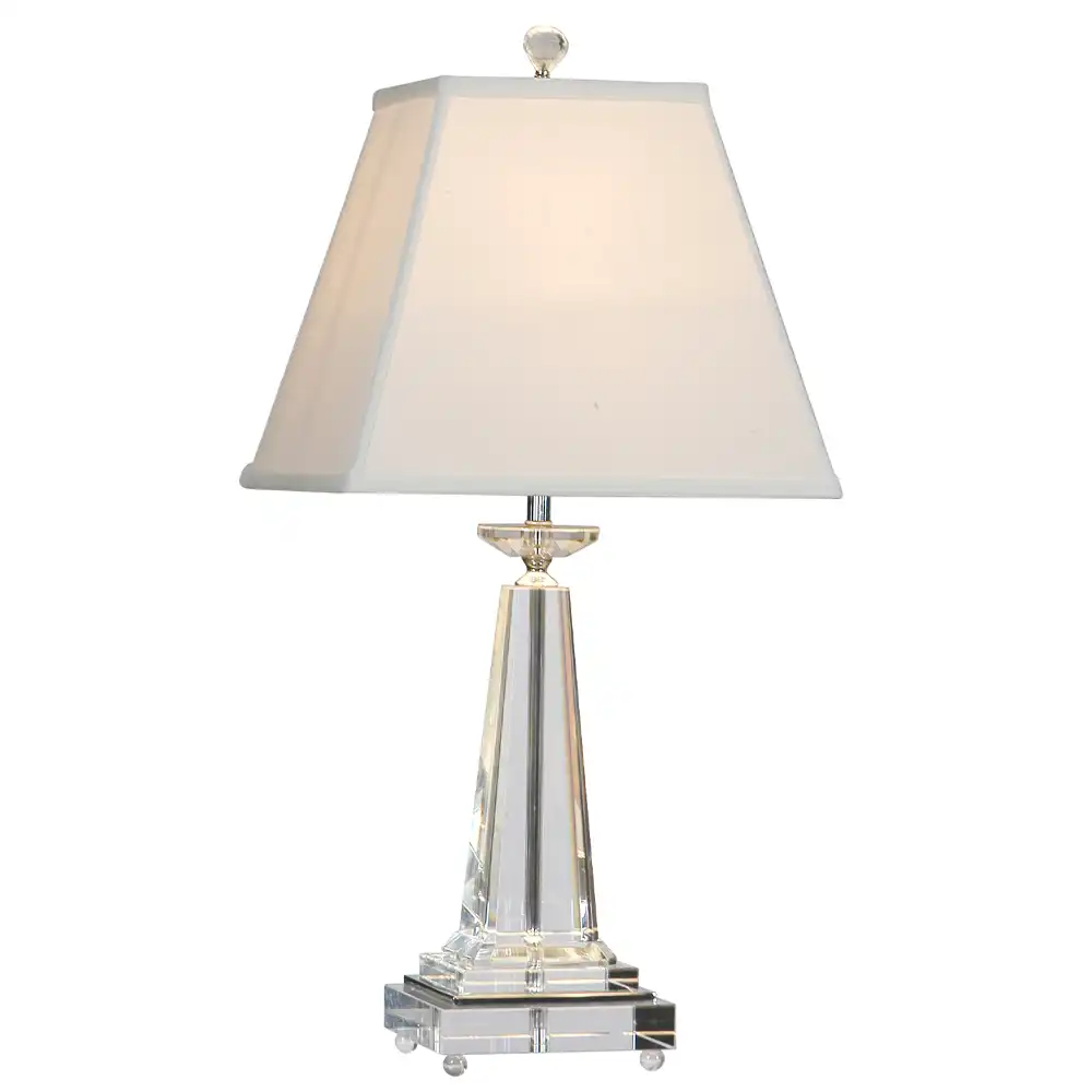 Crowning this luminous base is a distinctive square empire lampshade, crafted from premium, translucent fabric in a pristine white. This elegant shade softens the light, creating a warm, inviting glow that is perfect for focused tasks or ambient lighting, while maintaining the lamp’s overall sense of refined elegance. A delicate crystal finial, mirroring the lamp’s faceted design, provides a perfect finishing touch, further enhancing its luxurious appeal.
